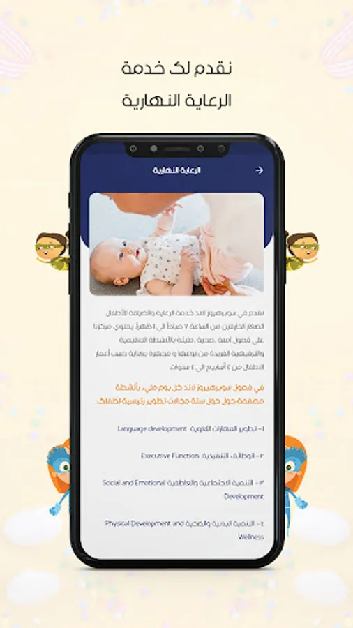 An application that displays the services provided by the nursery, through which you can add the child and teach him daily reports and photos.