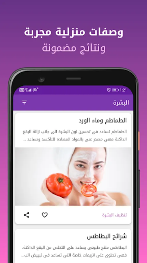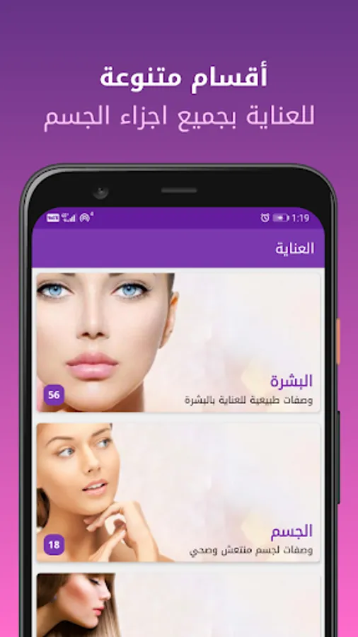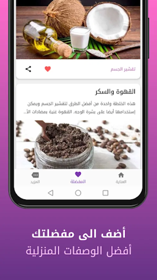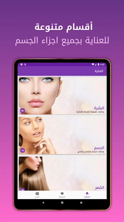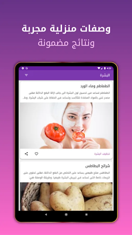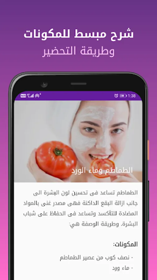 نقدم لكي سيدتي هذا التطبيق المجاني الذي يغنيك عن تضييع وقتك الثمين في البحث عن طرق العناية بأجزاء الجسم المختلفة في مختلف المنتديات والمواقع والتي تكون معظمها بدون نتيجة، يحتوي هذا التطبيق على مجموعة مميزة من الوصفات والخلطات المنزلية الفعالة والمجربة للعناية بجميع اجزاء الجسم (البشرة - الجسم - الشعر - القدمين - اليدين - الحواجب - الرموش - الشفاة - الاسنان) بأسهل الطرق وبدون مخاطر او آثار جانبية وبالاضافة الى ان مكوناتها الطبيعية مئة في المئة ،غير مكلفة ومتوفرة في معظم المنازل عكس الكريمات الغير طبييعة التي قد تتسبب في اثار وندبات على البشرة والتي قد يصعب ازالتها.