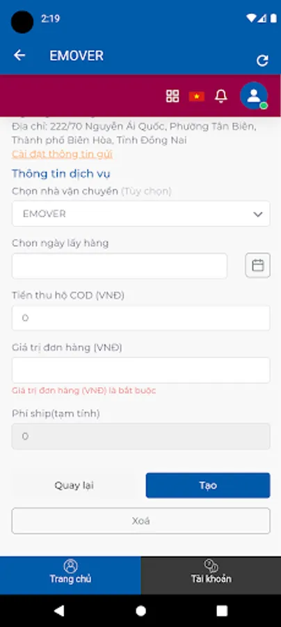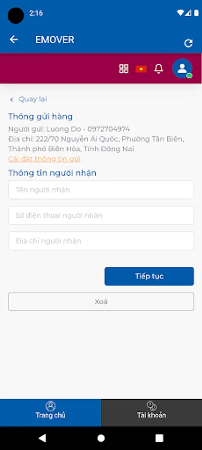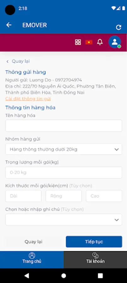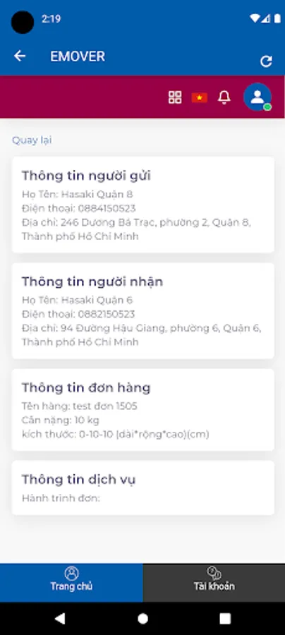 eMover is a convenient and smart mobile application developed to help shippers easily place shipping orders quickly and efficiently. With a user-friendly interface and advanced features, eMover offers an unsurpassed experience for shipping management and ordering.