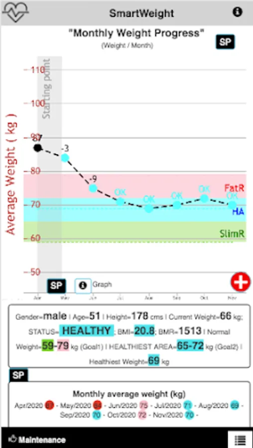 8) It keeps track of weight progress by accessing monthly (or weekly or day by day) historical values and statistics(a monthly-average representation provides with a better representation of weight loss/gain/maintenance efficiency)