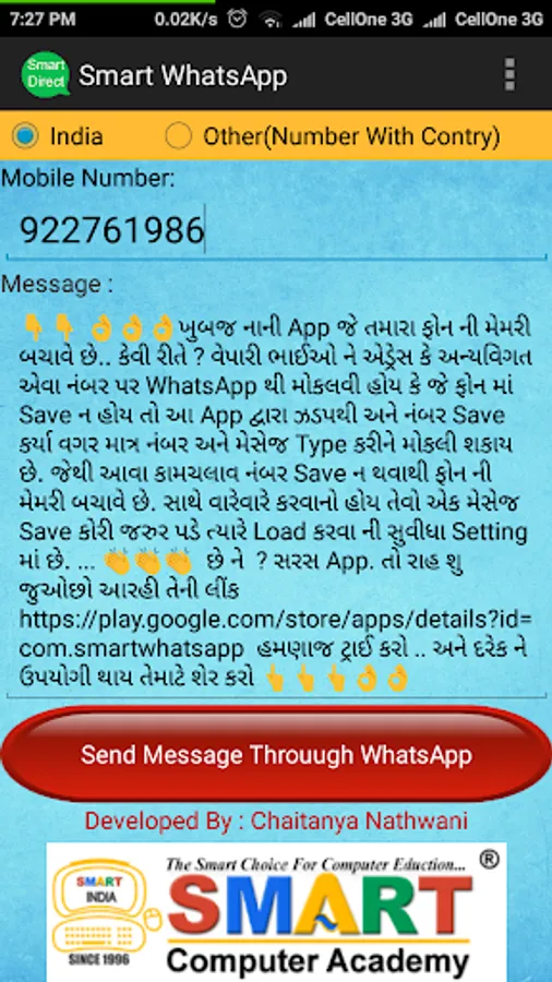 App for send WhatsApp Message without save number on your mobile in india without country code and in other country contact with country code. In 3.0.2 we provide WhatsApp with WhatsApp Business. You can Change it from Settings and Configure and select your WhatsApp Regular or Business. You Can Set Default Message from Configuration