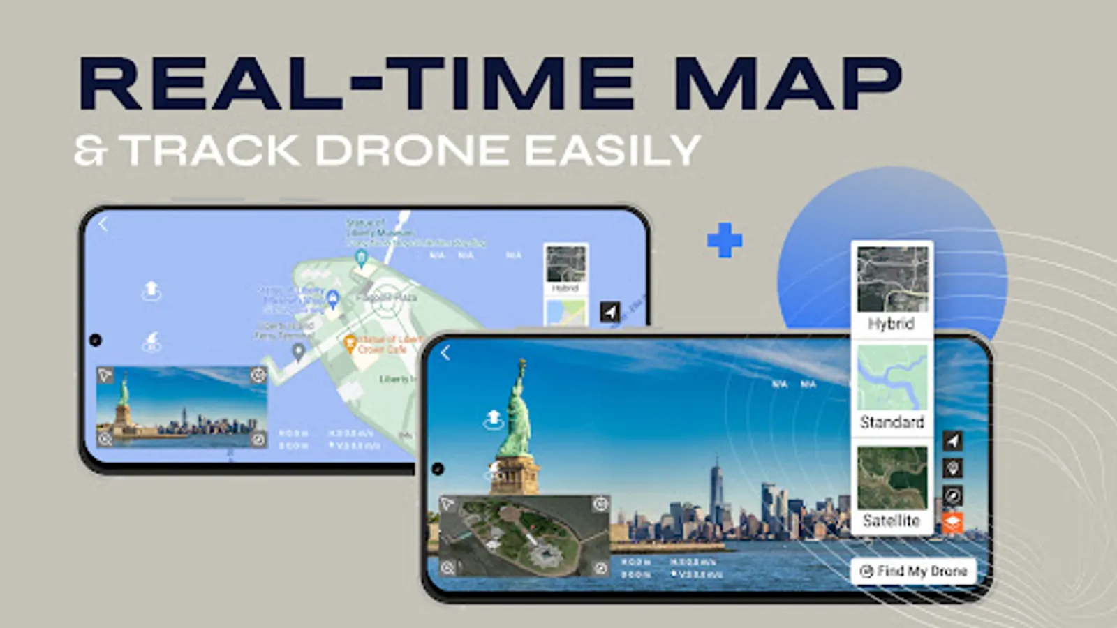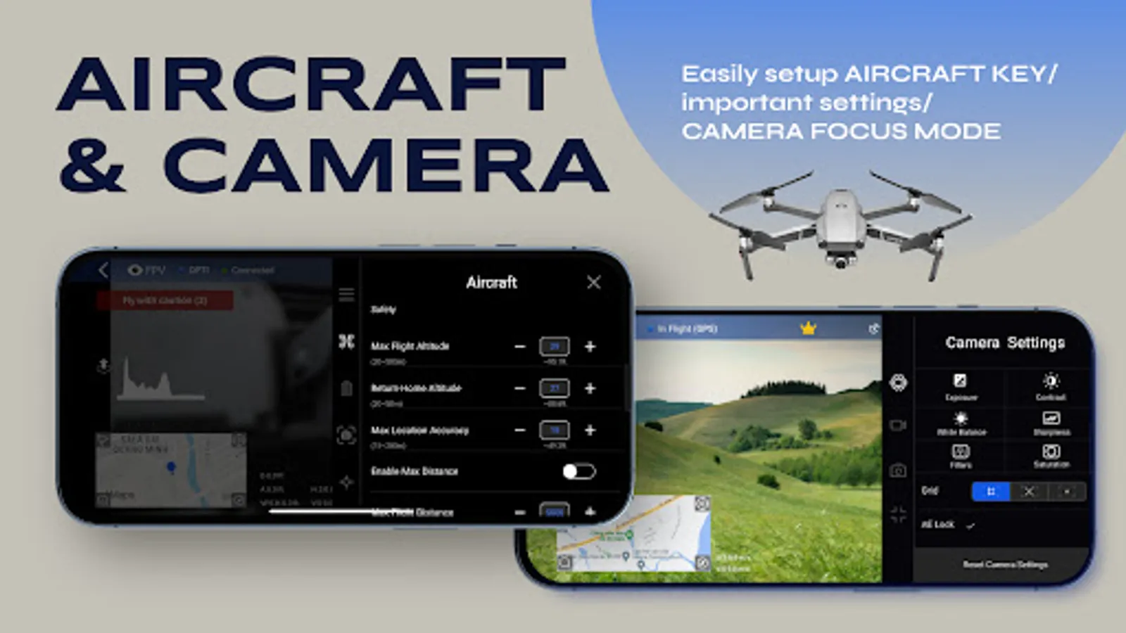 + Focus mode: Go Fly for DJI aids you by taking over control of the drone's yaw axis and gimbal, allowing you to concentrate on horizontal movements.