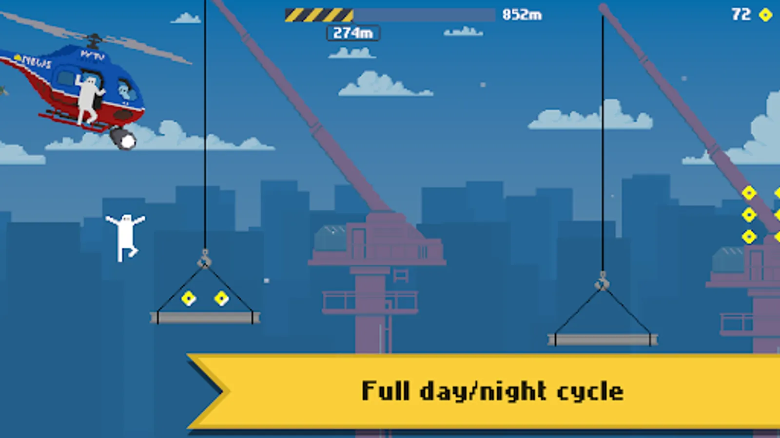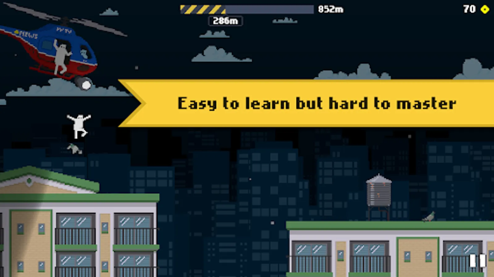 Rooftop Ramble is a fast-paced, easy-to-learn but hard-to-master endless runner game set in a retro-inspired pixel art city. Lunge from building to building while jumping over and sliding under obstacles to keep improving your best score.