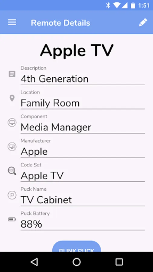 Note: This app uses an external Bluetooth LE to IR (Infrared) module (PUCK®) that provides for simple exchange of infrared remote codes. The app must be paired with the PUCK® hardware to be fully functional.