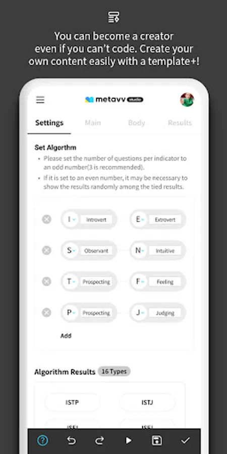 - Use Template Plus(metavv Studio) : Design your own custom content! You can create content with your own ideas and expand your audience. Create Disposition-Type test, Quiz-Grade test, Room Escape without coding.