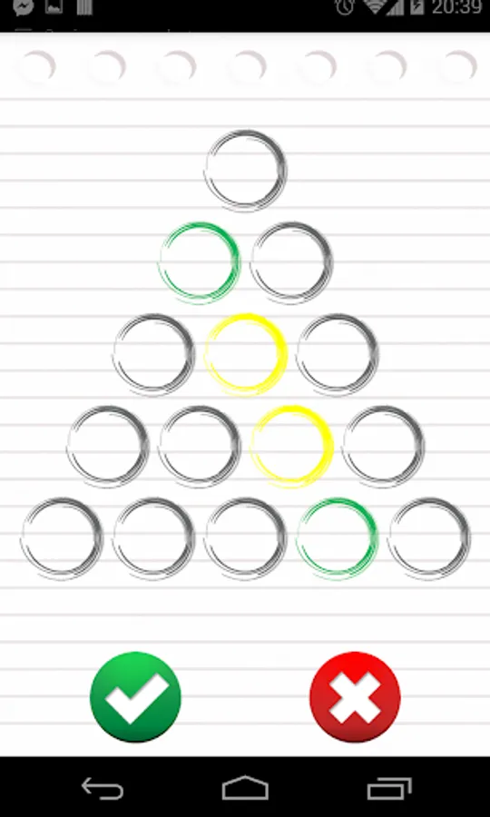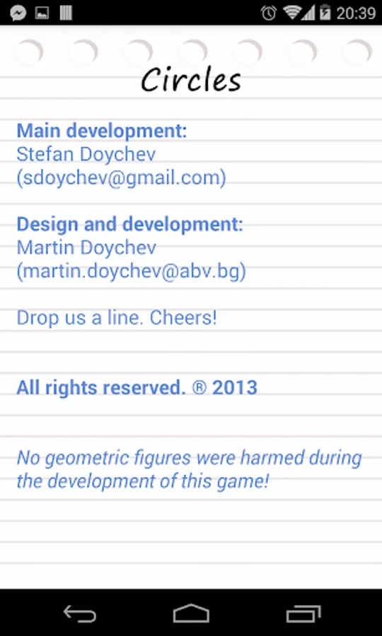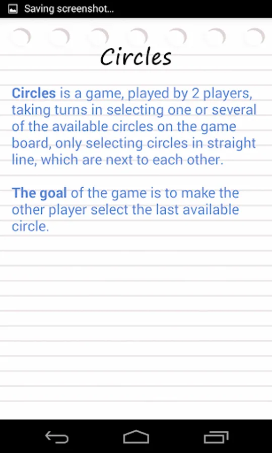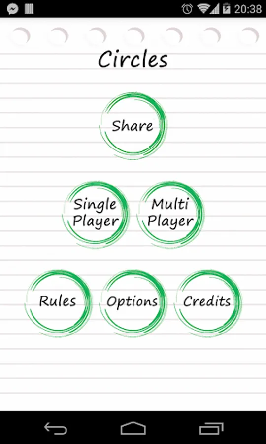 Circles is a game, played by 2 players, taking turns in selecting one or several of the available circles on the game board, only selecting circles in straight line, which are next to each other.