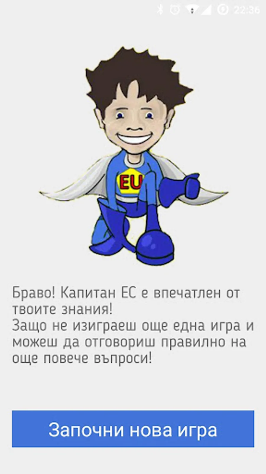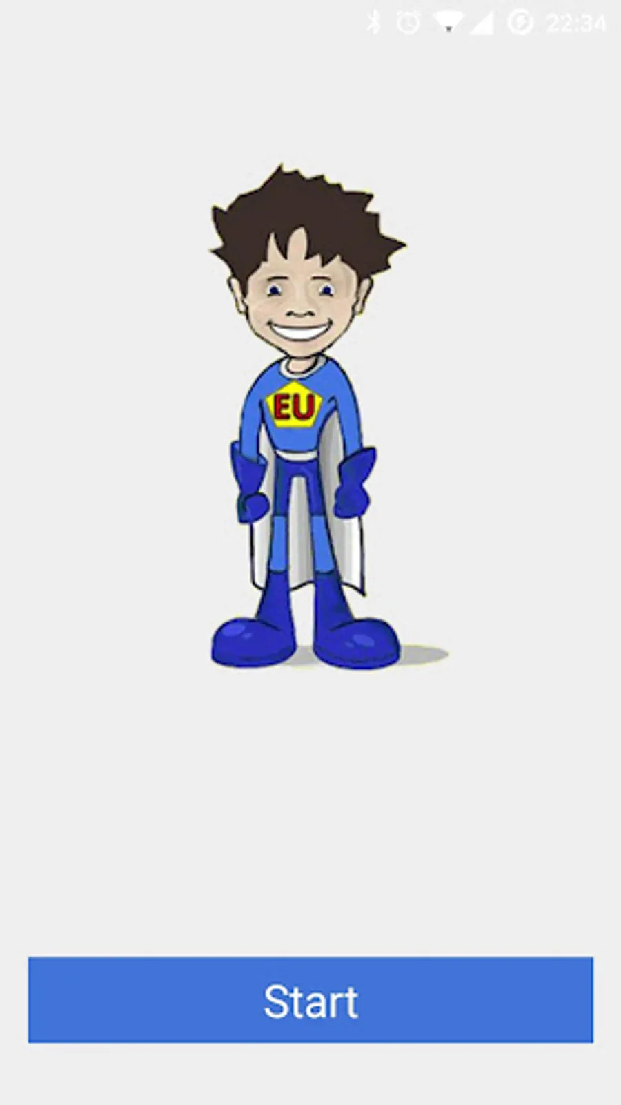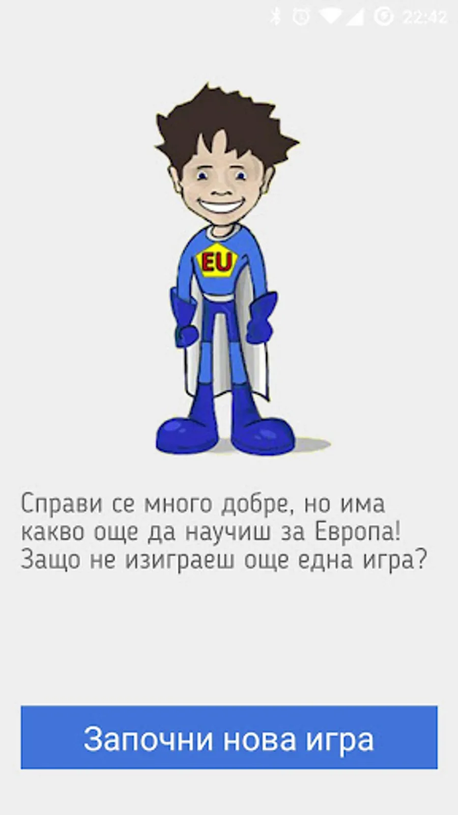 European identity booster is a mobile application, which represents a quiz on European topics. The main figure is Captain EU, who leads you through the questions and then tells you the result you got.