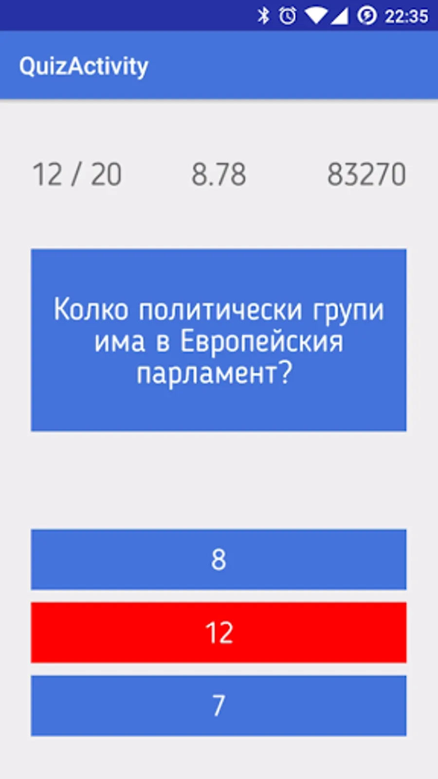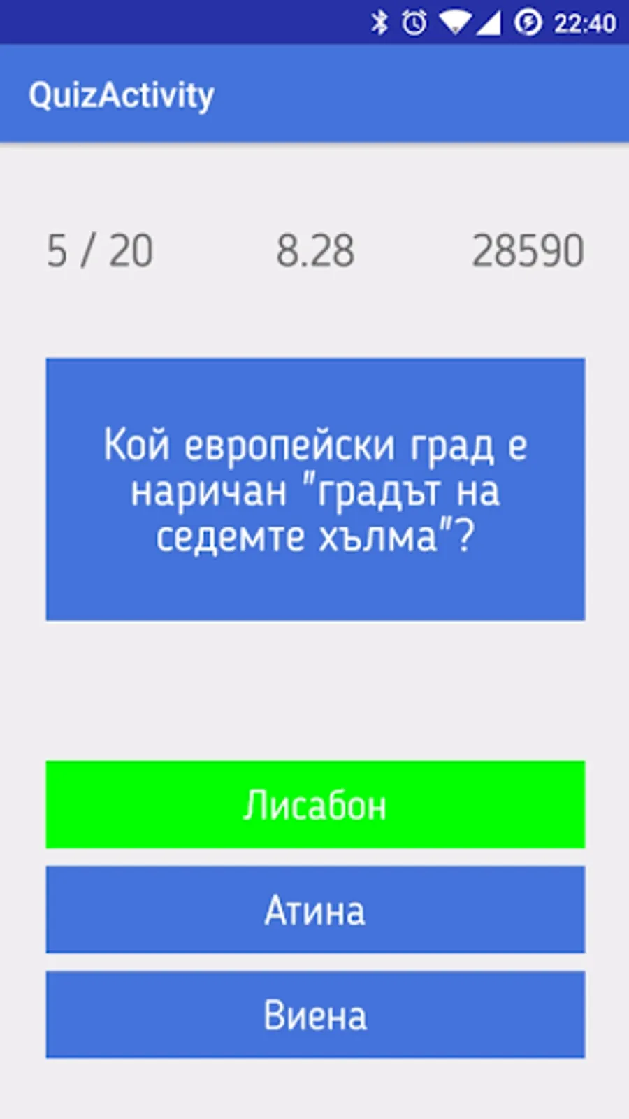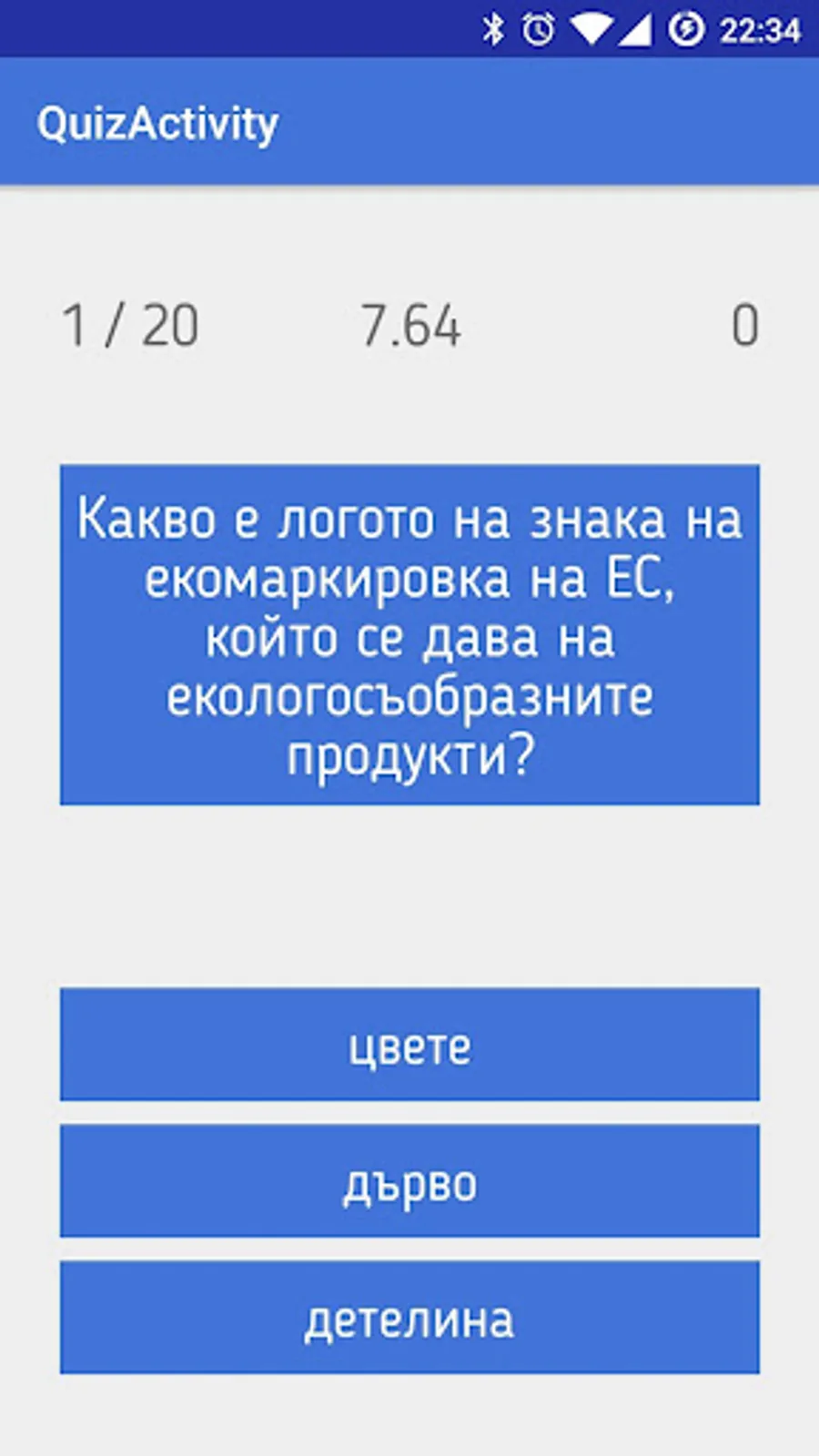 The application loads randomly 20 questions of the database and people have to choose between three answers. There is no time limit, but the faster the answers are given, the more points are earned.