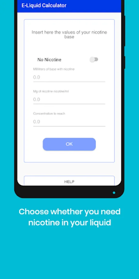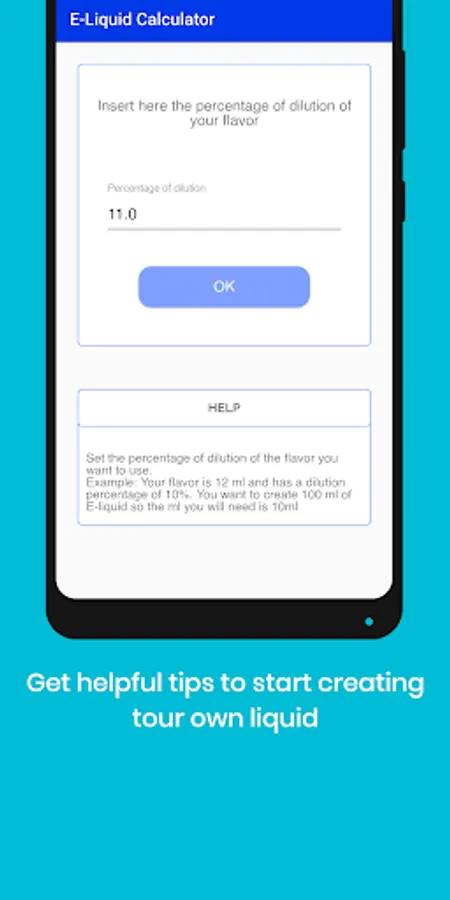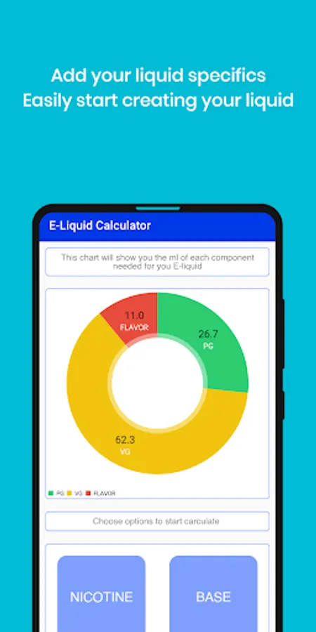 Open the app, insert the caratteristics to want your liquid to have and get everything done to make your own liquid.
