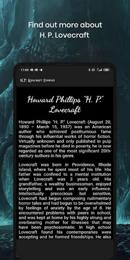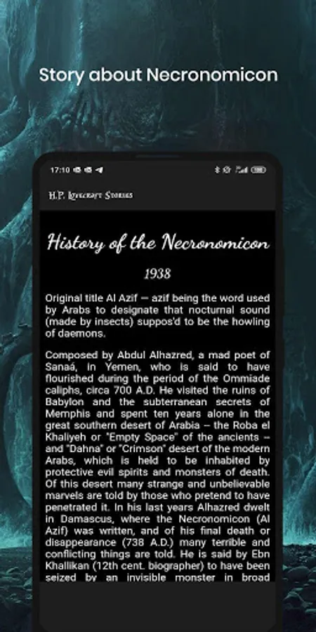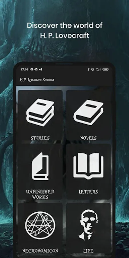 This app contains the complete horror fiction stories and novels written by H.P. Lovecraft. An accurate description of the Necronomicon and much more!