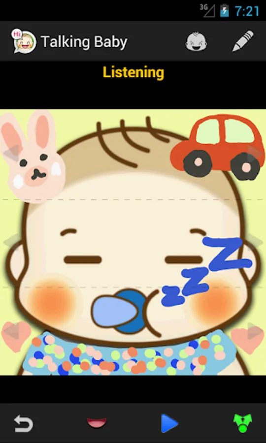 Talking Baby allows you to create your own personal Emoticon video, and share it via WhatsApp, or any other chat, messaging apps! Baby repeats everything you say and can be recorded to video. To pick your favorite faces, eyes and mouths, you can simply swipe your finger across the screen. Also you can unleash your inner creative genius, to draw something in your own Emoticon! It is a cool and fun way to connect with your friends!