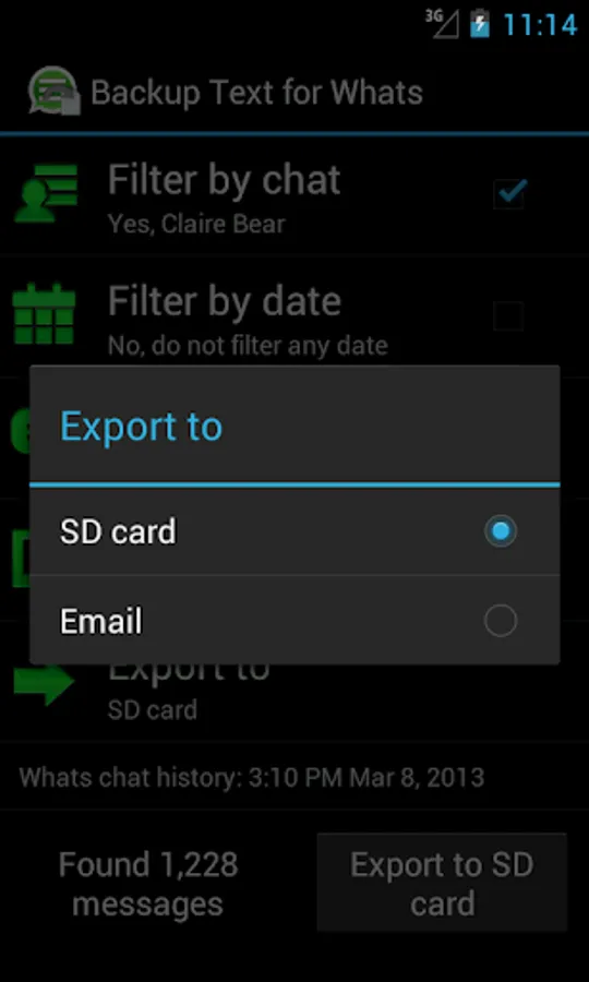 Backup Text for Whats allows you to export your Whats messages, convert to Plain Text, CSV, Excel and HTML file formats and yes, those files can be read in your phone or computer! Your exported files can be saved on your phone's SD card or sent to your email as attachment. It is fast and easy to backup your Whats messages!