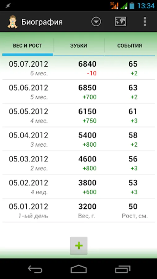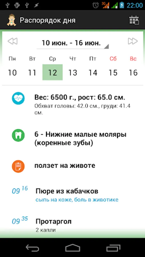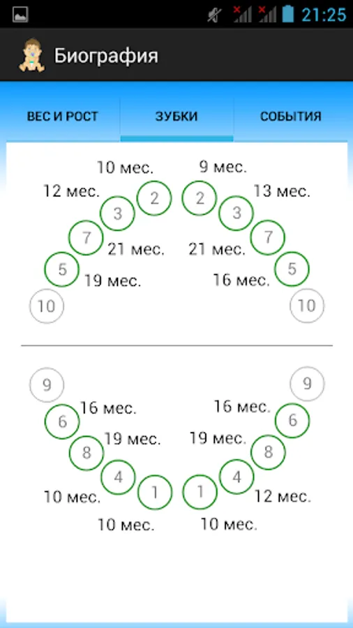 - Biography: entering data on the growth and weight of the baby (comparison with WHO standards), drawing up a teething schedule, recording the main events (crawling on the tummy, sitting, smiling, etc.).