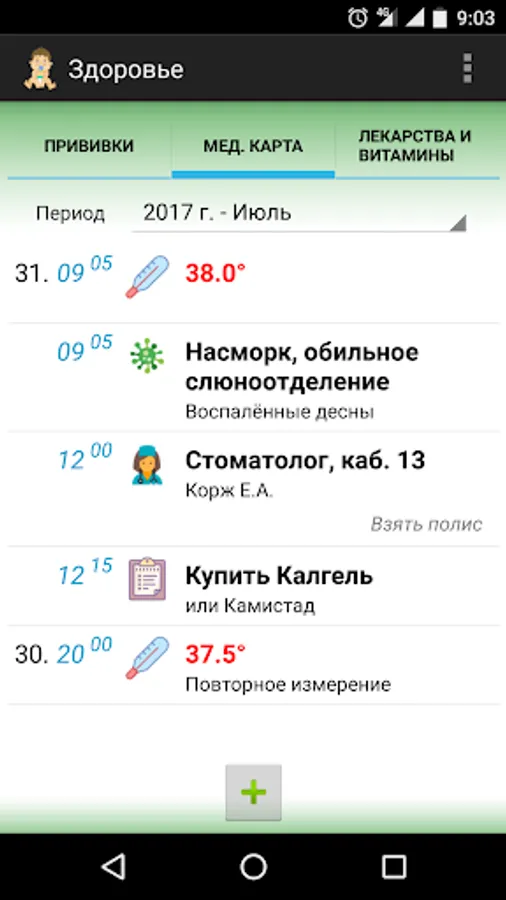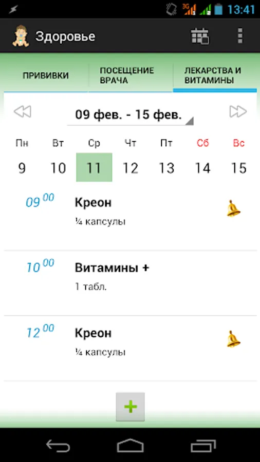 - Health: scheduling of vaccinations (the section contains detailed information), filling out a medical record, scheduling visits to a doctor (integration with the Google calendar), taking medications and vitamins with notification support.