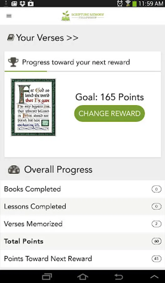 • Earn points as you memorize Scripture, and redeem those points for free rewards