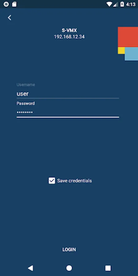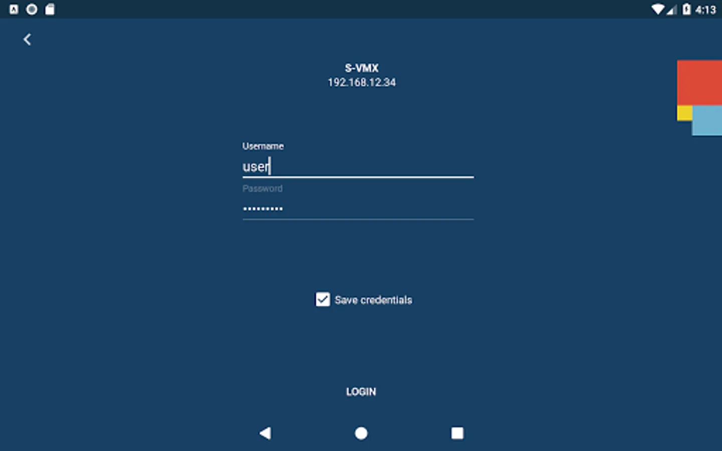 The application is available in the Google Play Store. After installation it can be accessed from the S-VMX icon on the device. When the application is started for the first time, connection parameters to S-VMX server need to be configured: