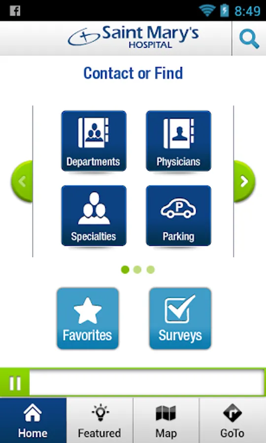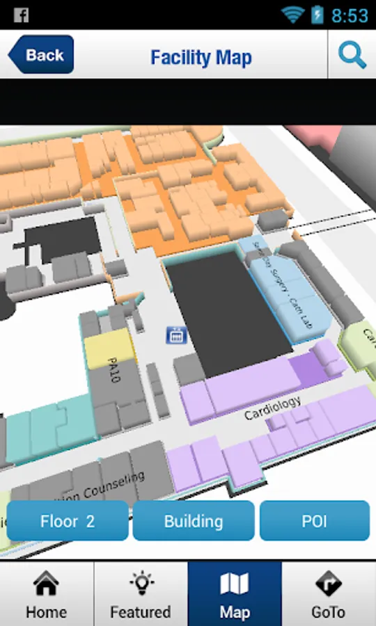 Indoor mapping with turn-by-turn directions and click-to-call directory of hospital departments and physicians as well as hospital news and announcements.