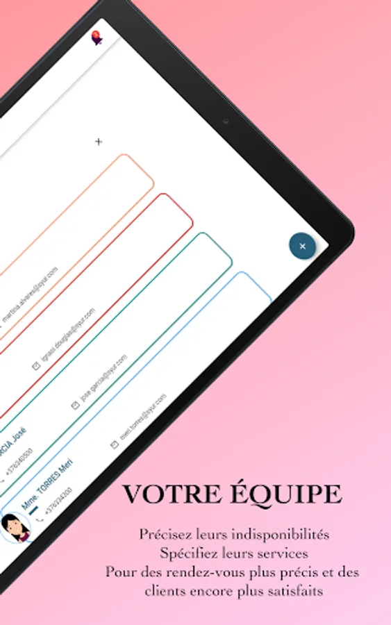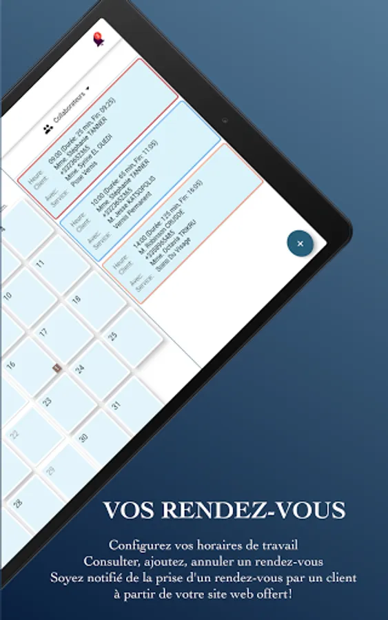 Podeu gestionar la vostra unavailability established dates and times of absenteeism, determined puntualment or puntualment. També podeu restringir cada empleat dels serveis que no sofereixen. Es mostrarà una bandera during una cita per informar-vos that a place encarregat of a servei is absent aquell dia.