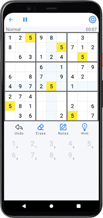 The playing field is a 9x9 square, divided into smaller squares with a side of 3 cells. The goal of the game is to fill the empty cells with numbers from 1 to 9 so in each row, in each column and in each small 3 × 3 square, every number appears only once.