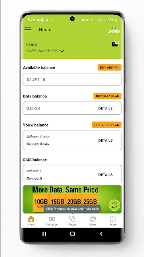 MySmile App with VOICE is here! Make and receive calls and SMSs using your MySmile App to/from any number in the world using your MySmile App. Activate your SmileNumber for voice by following the prompts on the App and you’ll be ready to make/receive calls. With the MySmile App, you can Recharge Data, Voice, and Airtime, Check Balances, Redeem Airtime Vouchers, and Share Data and Airtime whenever you want. MySmile App from Smile for all your service needs.