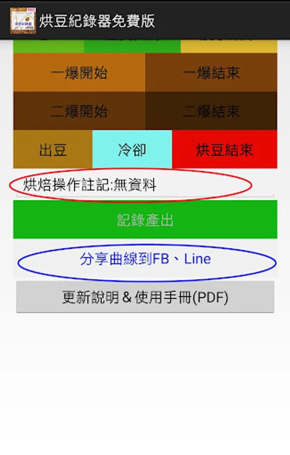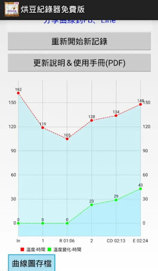 4. 溫度紀錄的參考時間點,會有:烘豆開始、進豆、反轉、一爆開始、一爆終了、二爆開始、二爆終了、出豆、冷卻、烘豆結束等固定紀錄點,隨著烘豆進程的變化,"烘豆時間”的顏色,也會有相應的變化。