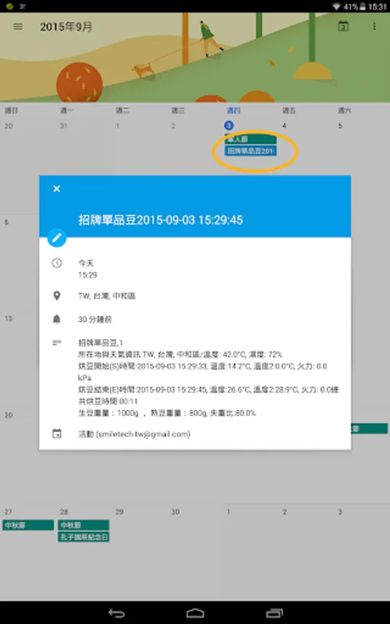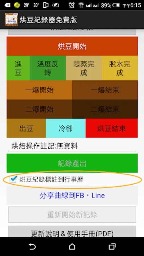 7. 烘豆紀錄(文字),自動存檔後,可以自行人工轉出發佈到Facebook或是作為電子郵件的附件寄給相關人員。
