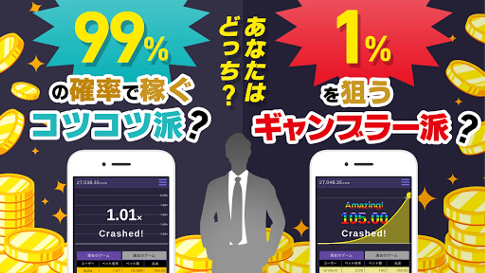・ The probability of crashing at 2x is 50%, 10x is 10%, and 100x is 1% (1x to 10,000x).