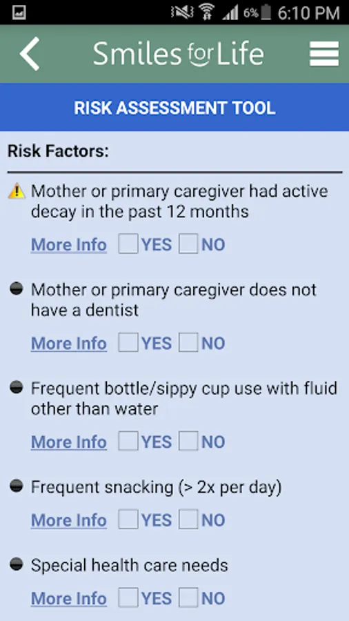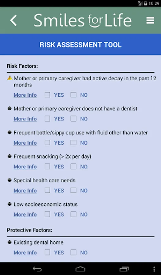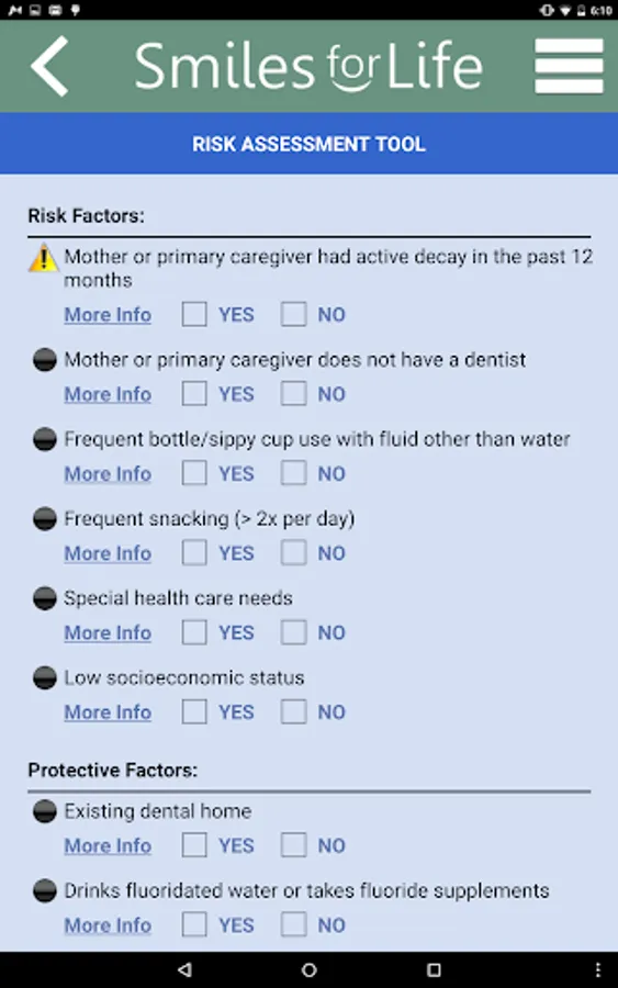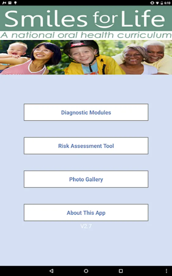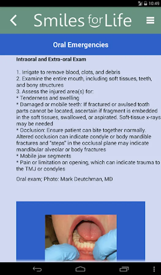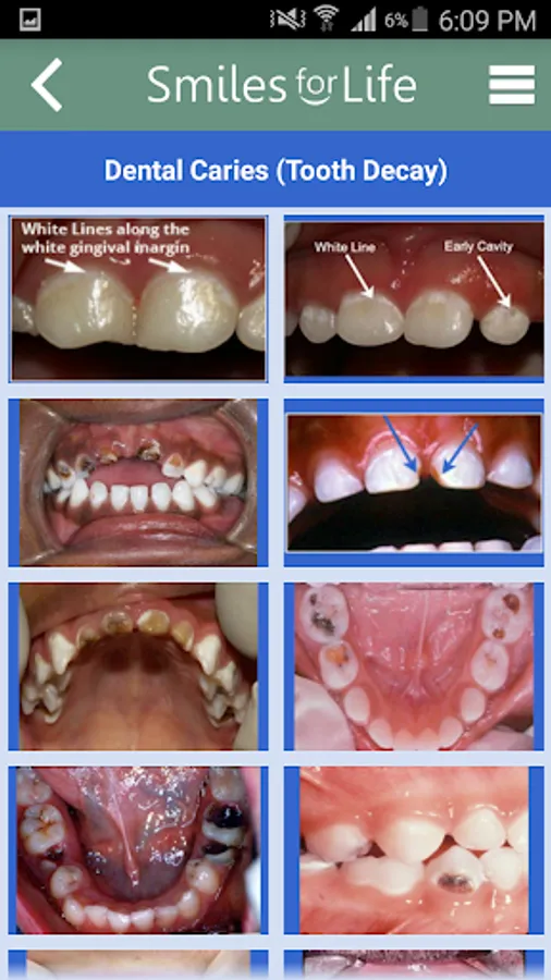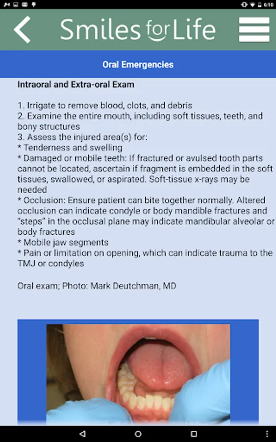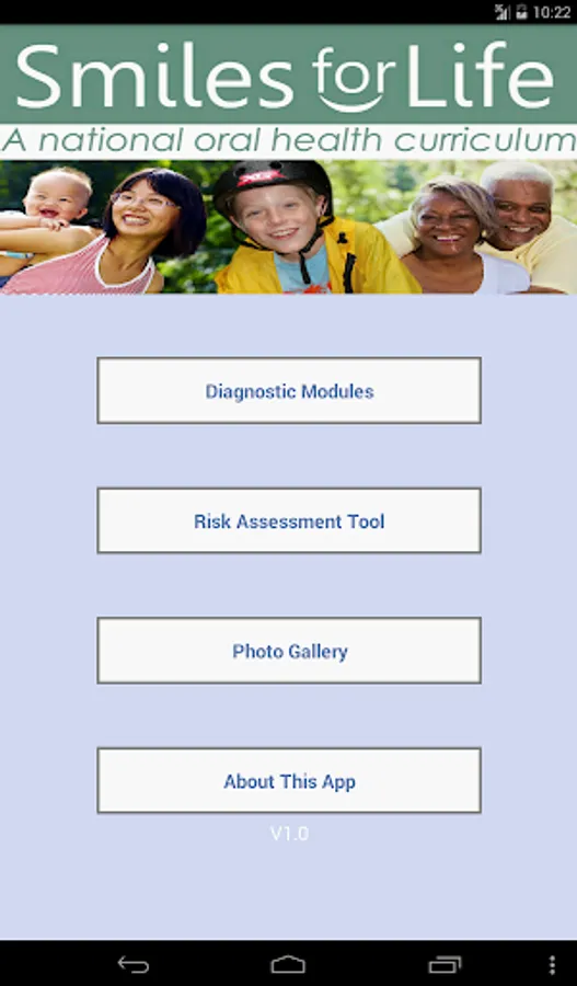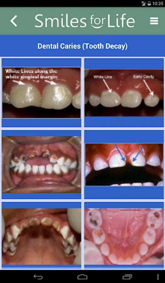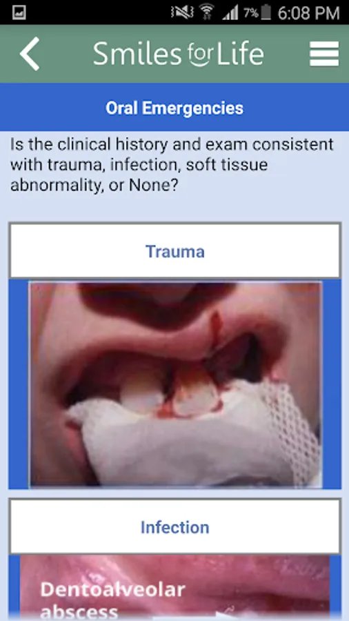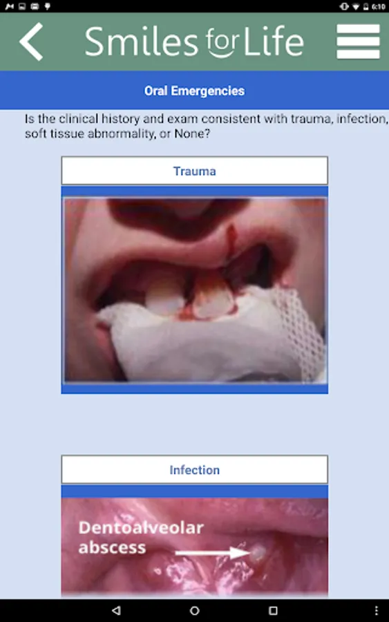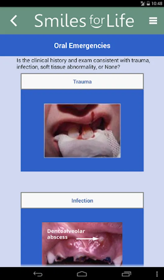 The Smiles for Life (SFL) Oral Health App is a reference tool for oral conditions designed to assist primary care providers in formulating diagnoses in real-time. Clinicians select an algorithm based on the presenting concern of the patient or physical exam finding, and the decision tool presents a series of questions to help formulate a diagnosis, triage, and treatment plan. Practical advice will aid clinicians in providing the best care for their patients. An extensive photo gallery of tooth and oral soft tissue findings is also included.