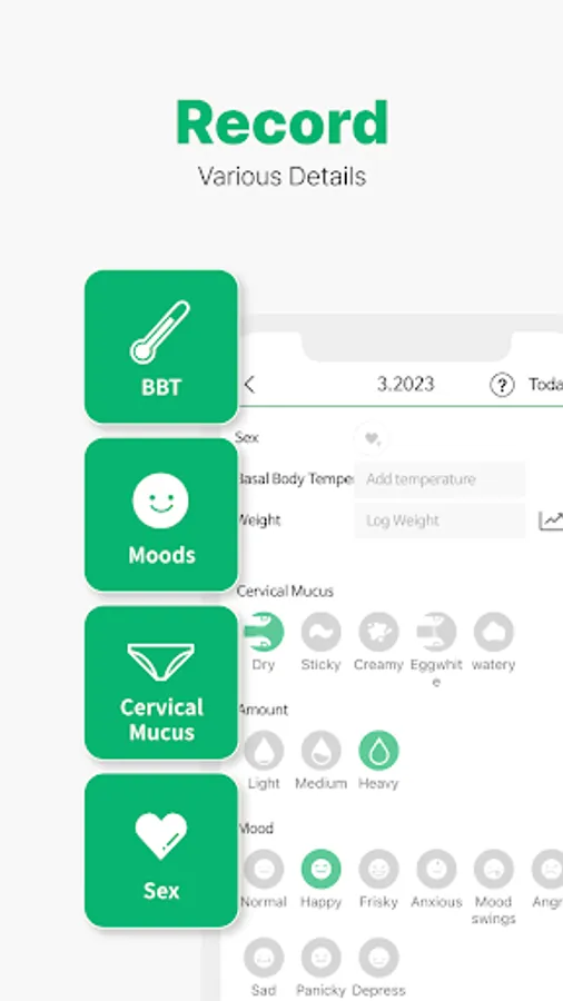Daily Log: You can also use the app to log in basal body temperature, changes in your cervical mucus, and even your mood and weight to increase the accuracy of prediction.