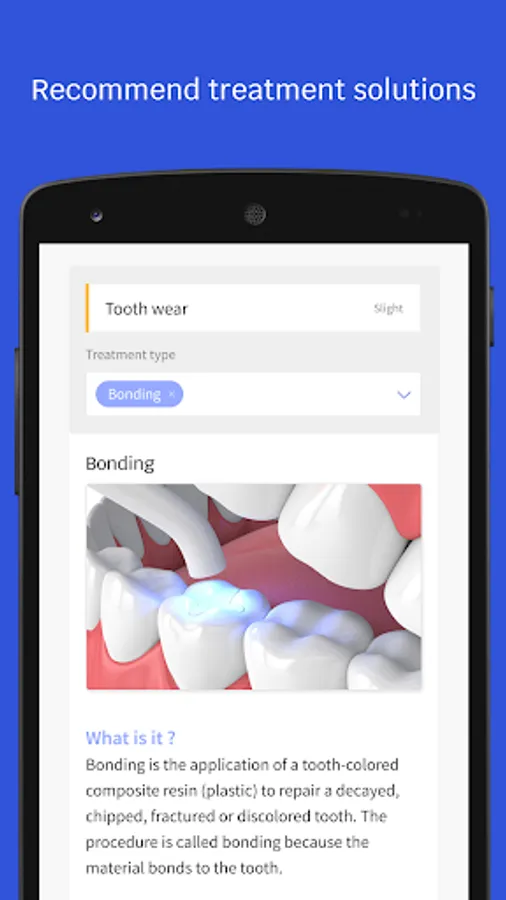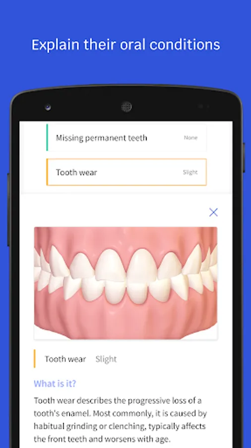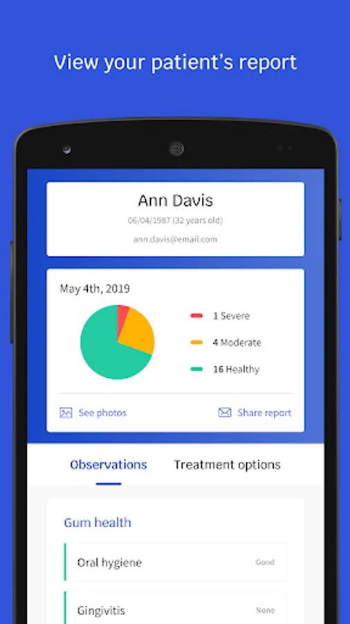Following guided smartphone scans taken in your practice, your patient’s smile photos are analyzed by Artificial Intelligence and evaluated by licensed clinicians to ensure accuracy of results. Within minutes, you can consult your patient screening report, including screening observations and treatment recommendations on your dedicated dashboard. A copy can be shared with your patient.