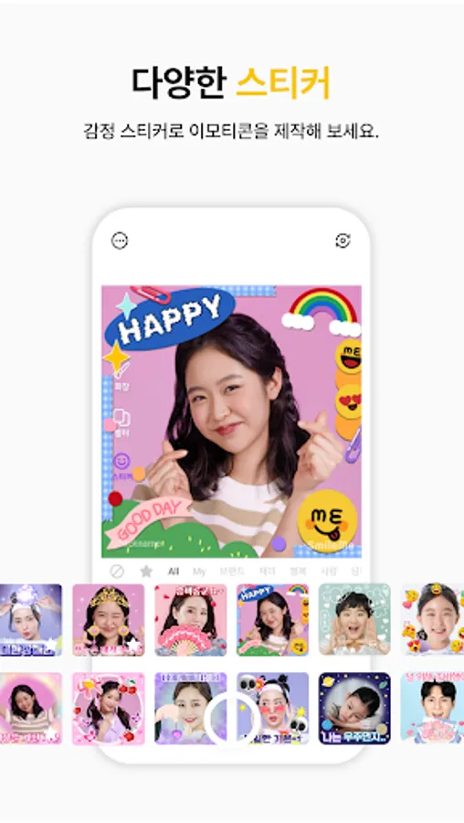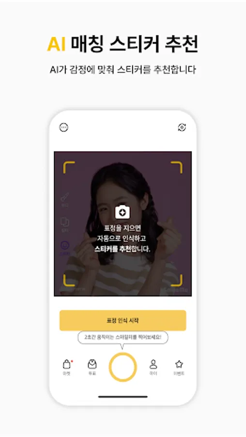 AI가 추천하는 감정 스티커를 통해 이모티콘을 만들어보세요.