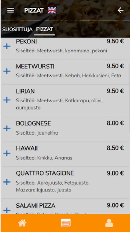 pizzat suoraan listasta, erilaiset valkosipulileivät tai extratäytteet ja annoksen kylkeen valittava juoma – tai