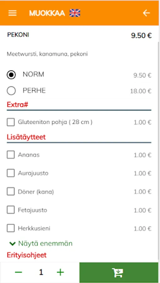 Valittuasi halutun ruoka-annoksen, lisäät sen ostoskoriin – tai valitset esim. lisätäytteitä. Voit tehdä vielä