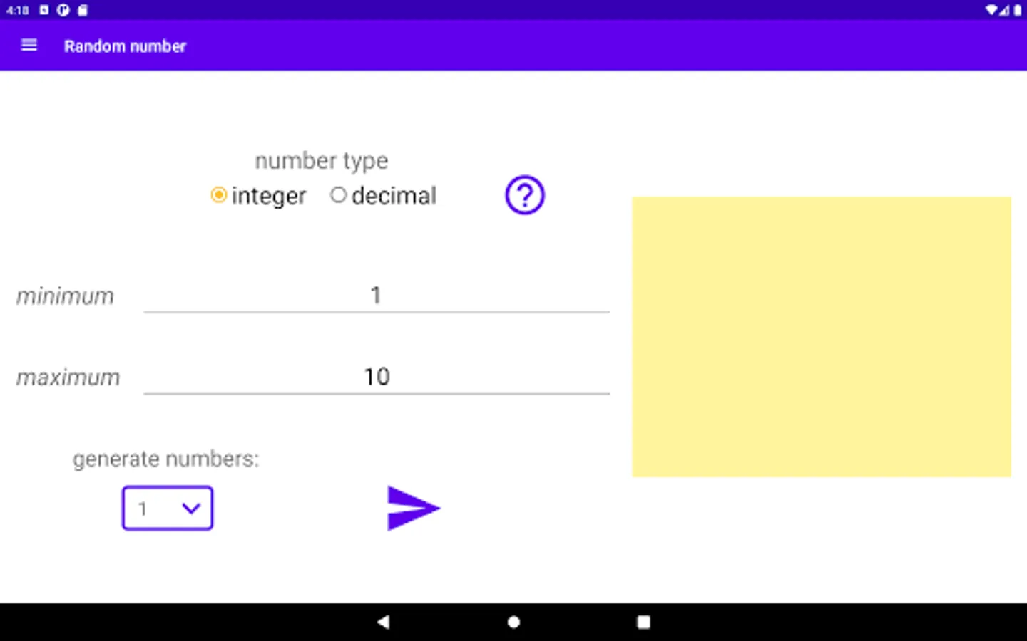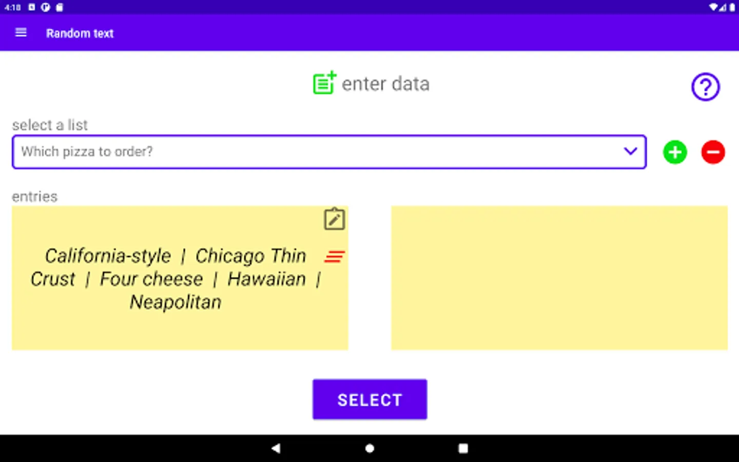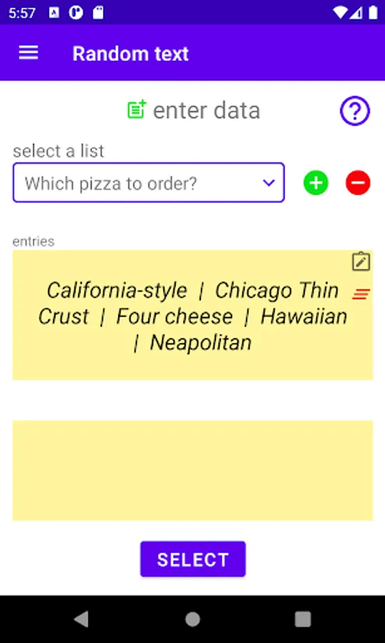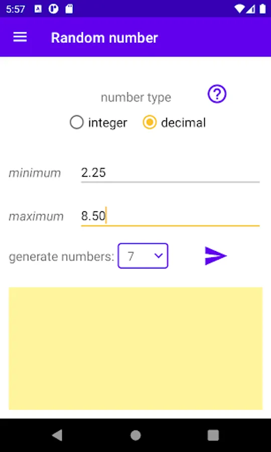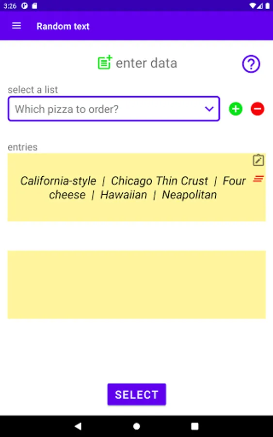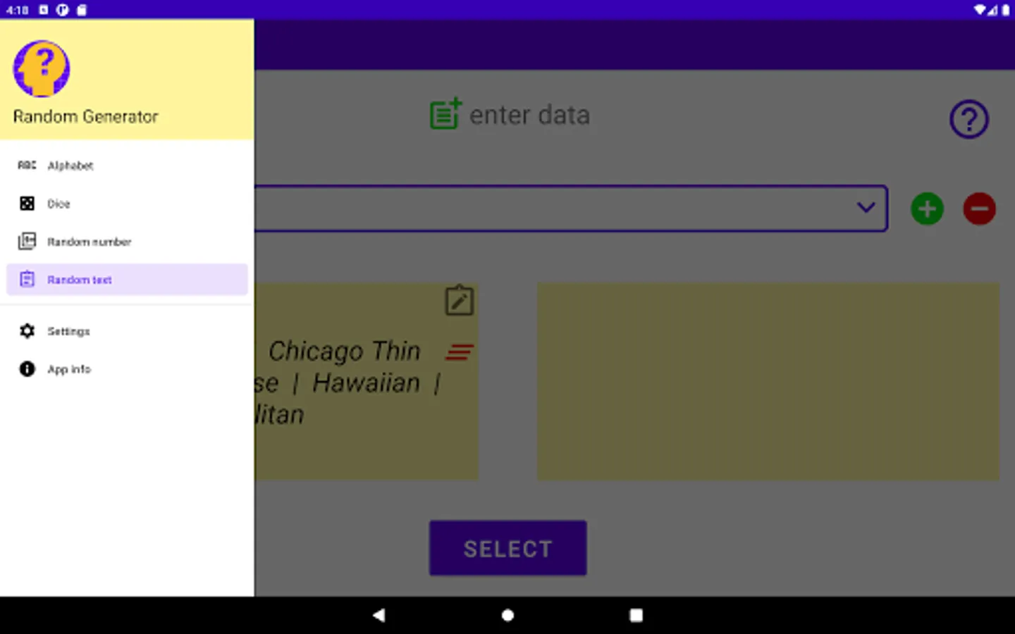 Random Value Generator is an app that allows generating random values of different categories in a simple way. It doesn't matter if you need a random number, want to display a random letter of an alphabet or a pizza choice. This app can do all that and much more. Just give it a try.