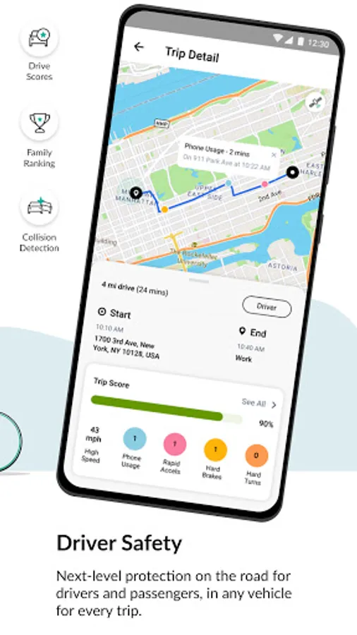 • Gain insight into specific trips with route details, miles logged, top speed, driving