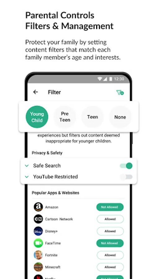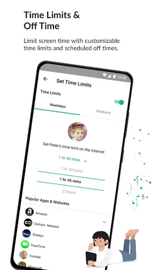 • Proactively manage the time children spend on their phone and restrict app-specific or