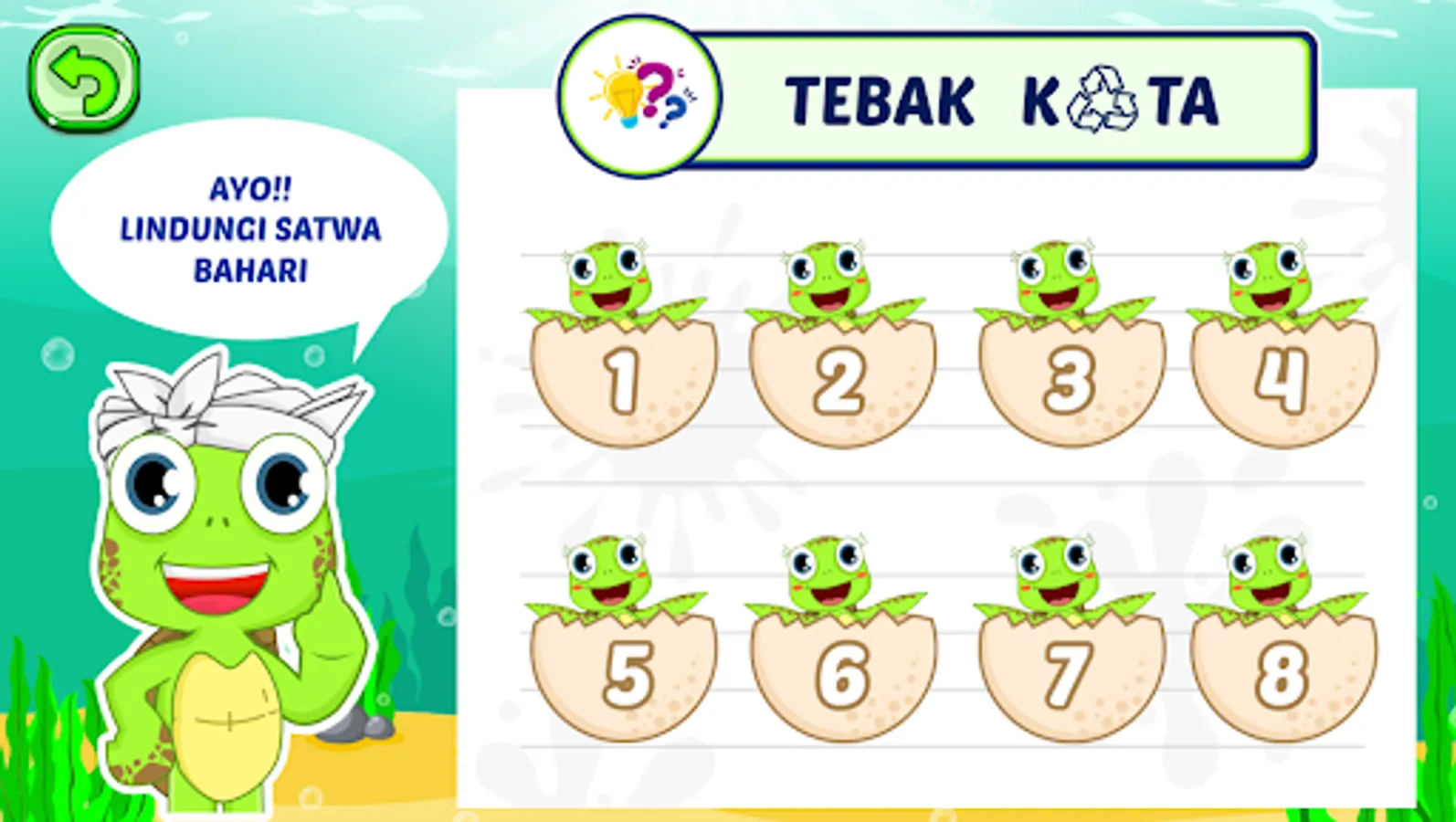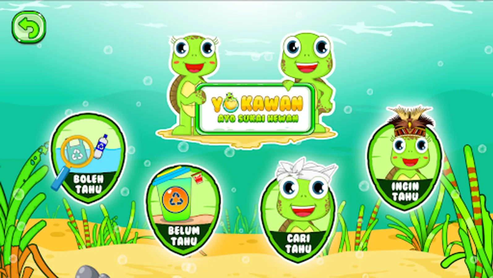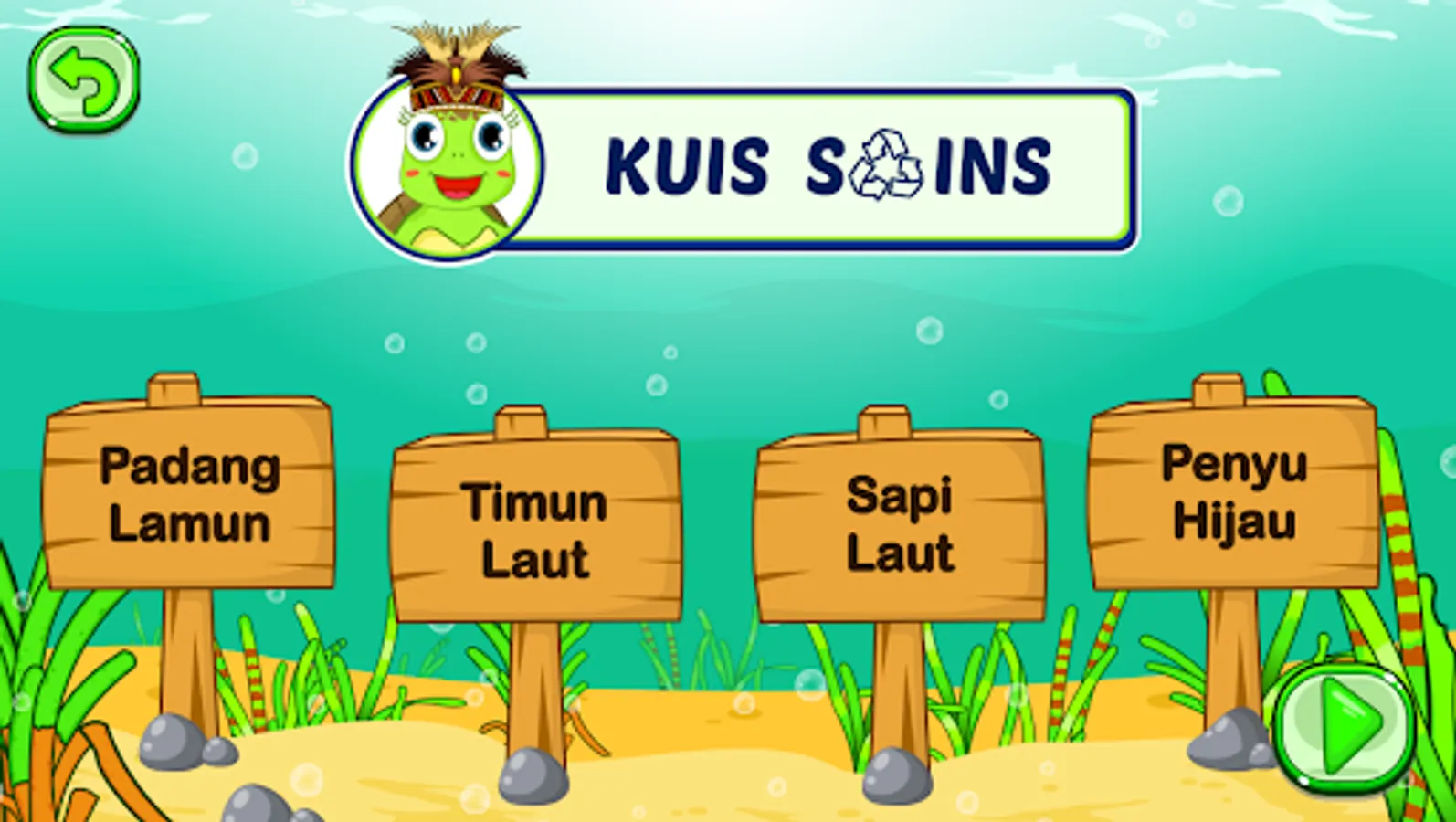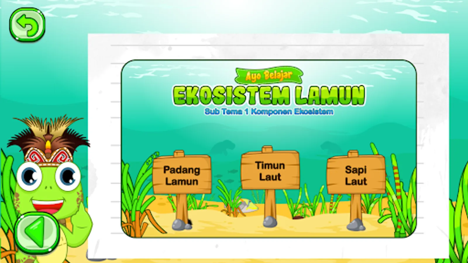 The learning menu for this application includes the seagrass ecosystem, the dugong's residence, the green turtle's friend.