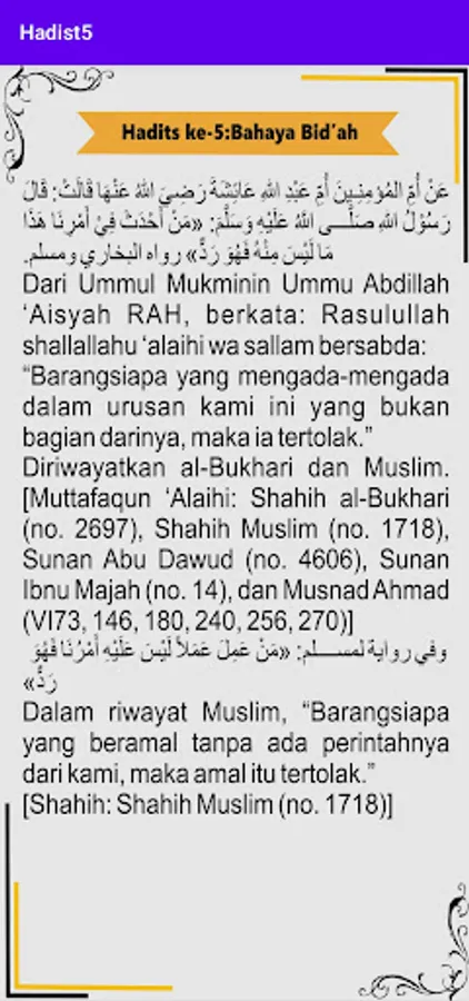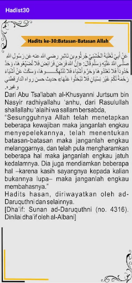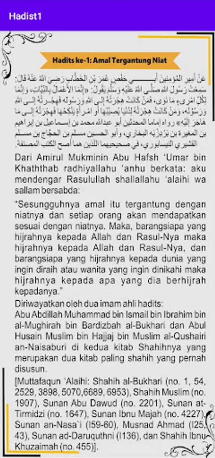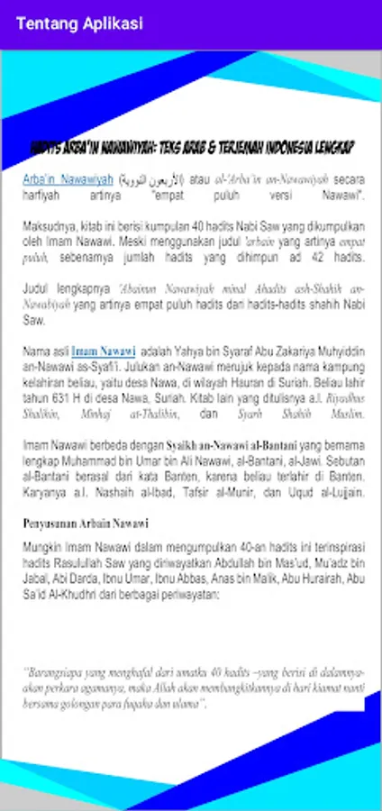 The Arbain Hadith application is the application of the Arbain Nawawi Book which is made as an application to make it easier for book readers without having to bother carrying books in the form of fairly thick prints. This Arbain Hadith application consists of a collection of Forty Two (42) Hadiths composed or compiled by Imam Nawawi.