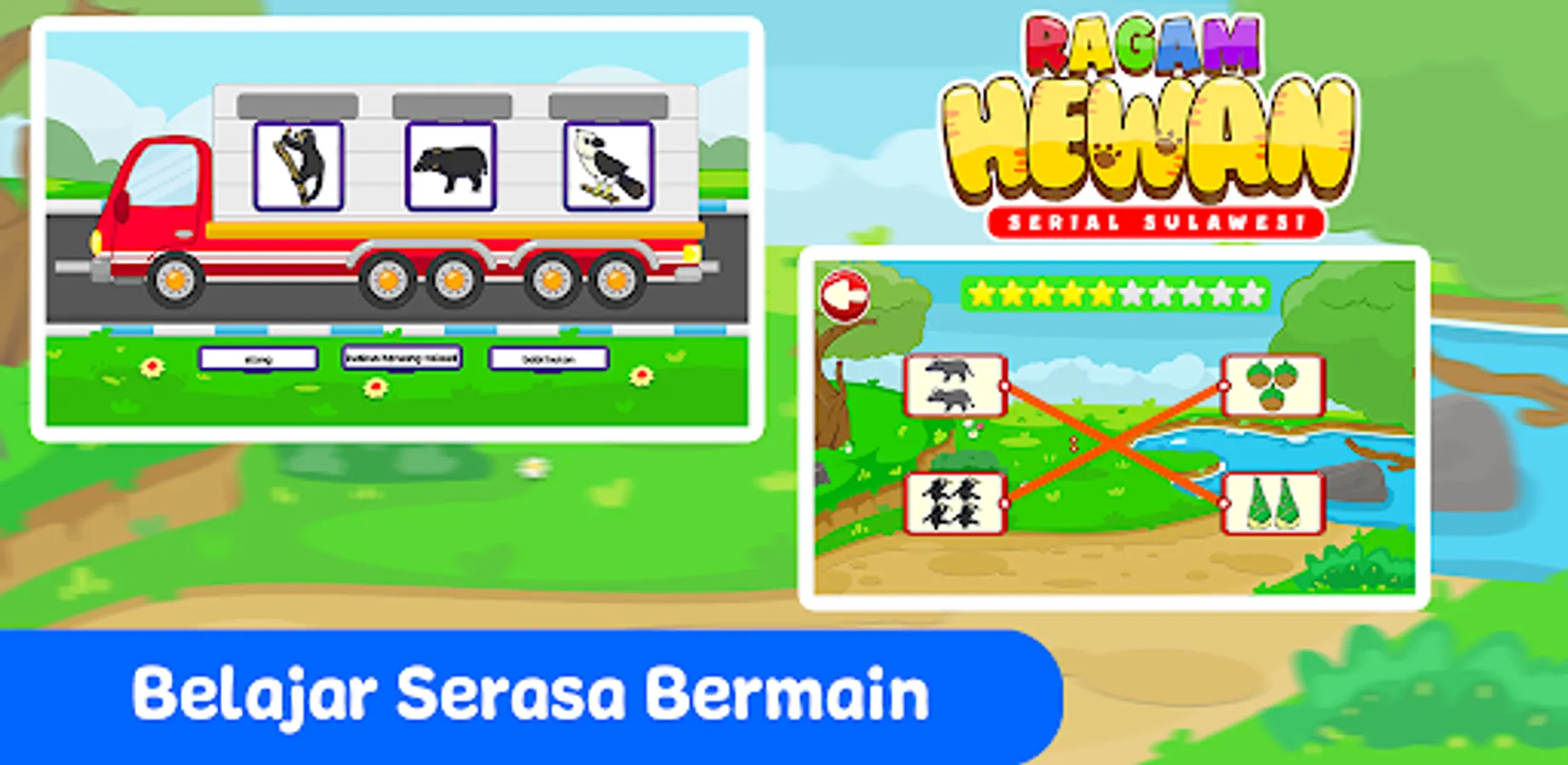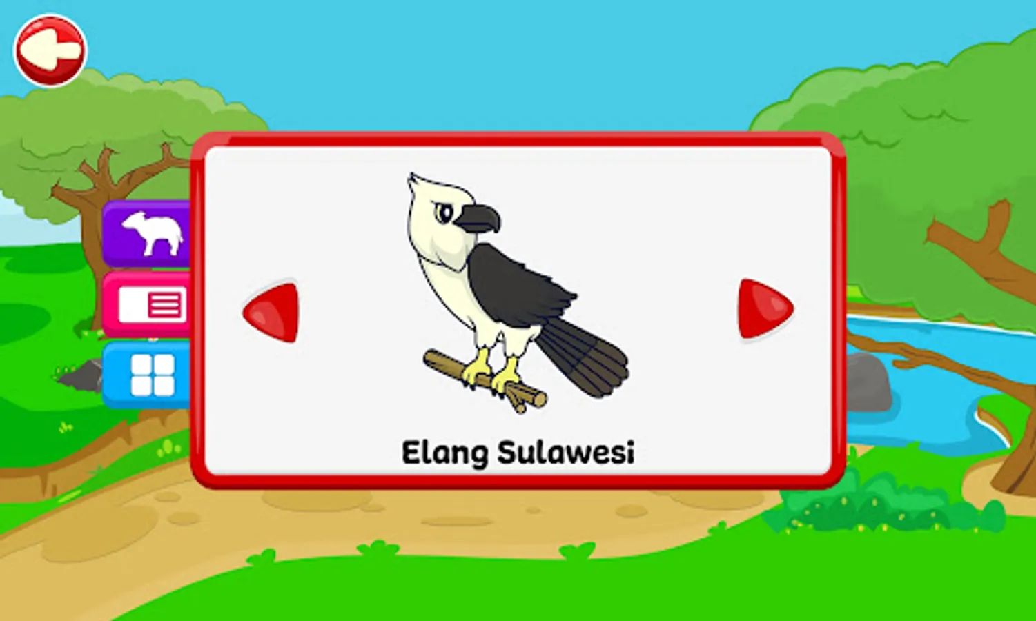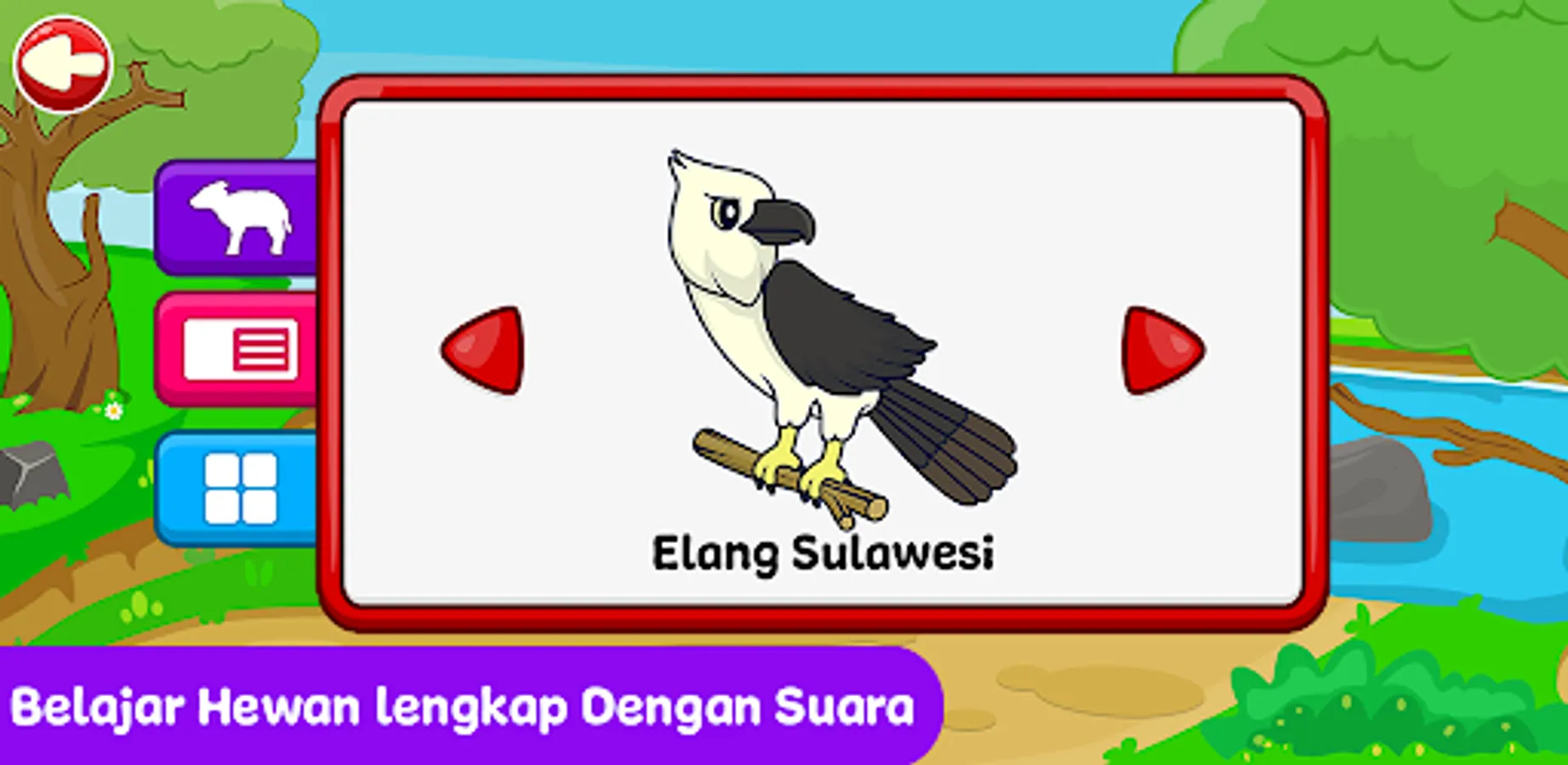 In this game, children will learn about the names of animals in Sulawesi, complete with their sounds and pictures. The concept of learning in this application is designed interactively with interesting games and interesting sounds so that children don't get bored while playing.