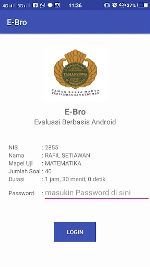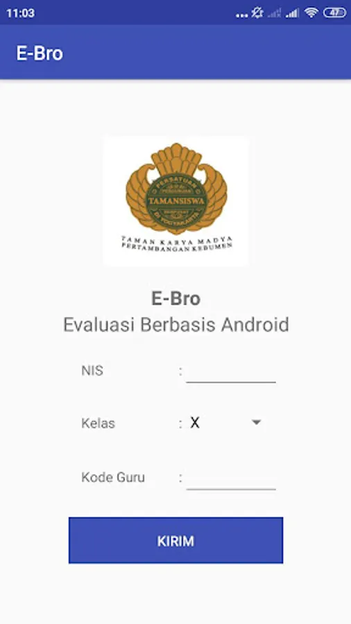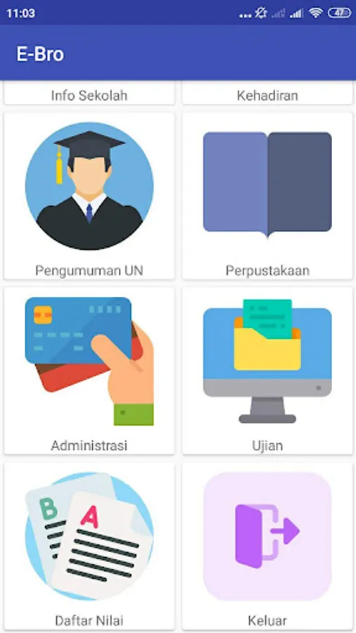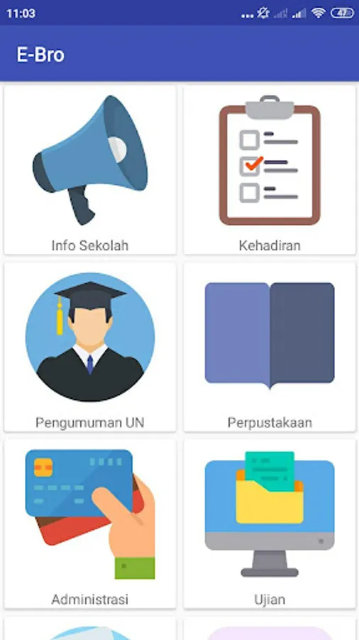 E-Bro Application is a School Management Information System Application developed by SMK TKM Mining Kebumen, with this application students of TKM Mining Mining Vocational School can conduct Learning Evaluations namely PTS, PAS, PAT and US online via android mobile phones with minimum specifications Kit Kat. In addition, with E-Bro students can also find out daily attendance, payment, and also a recapitulation of grades etc.