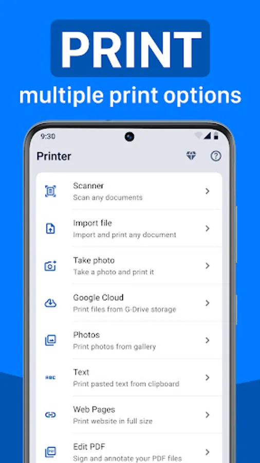 Printer app makes it easy for you to print from your Android devices. Just select the digital document from storage or scan it with your camera and send it to your Wi-Fi, Wireless or Bluetooth printer with just one click. We support most of the used document types like PDF and much more. You will love our workcentre.