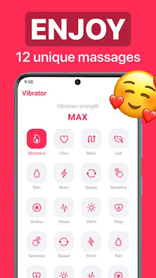 Discover the powerful vibration massager by Vibrator! We pride ourselves on being the strongest vibration therapy & massage app on the App Store. Vibrator is very simple and easy to use; choose a massage pattern, press play and enjoy a calming and meditative vibration massage! Vibration is inherently relaxing for most people. Vibrator lets you experience vibration massage therapy right on your phone. Our 12 massage patterns are scientifically designed to provide you with all the benefits of vibration massage therapy, in the shortest amount of time possible.