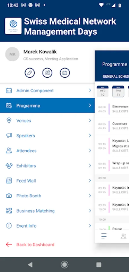 The Swiss Medical Network event app lets you vote, submit questions, message other delegates and exchange digital business cards, schedule meetings, complete surveys, create personal agendas, study virtual libraries and meeting information, review case studies, browse speaker and attendee profiles, follow presentations, take notes, save items for after your event and much more.
