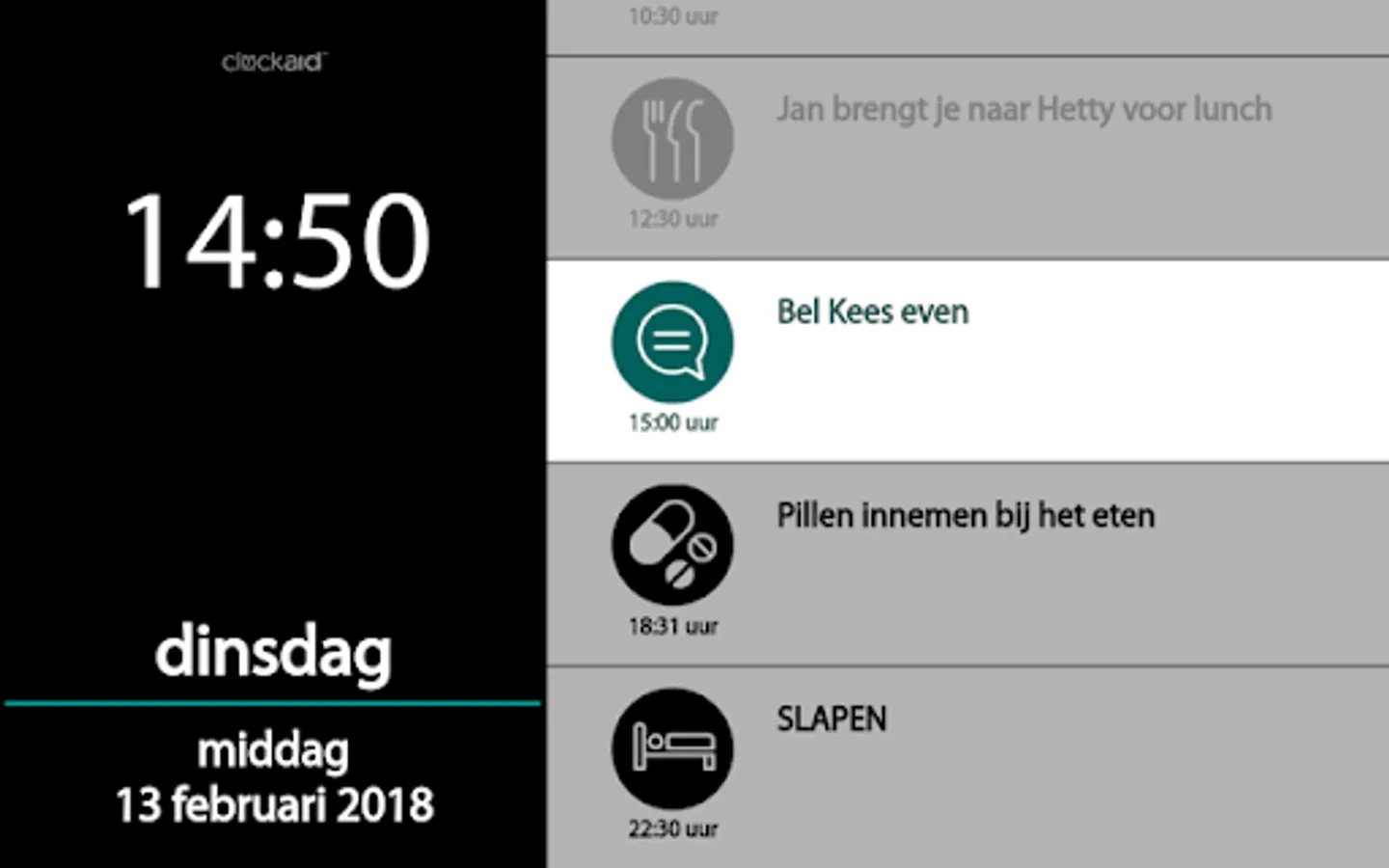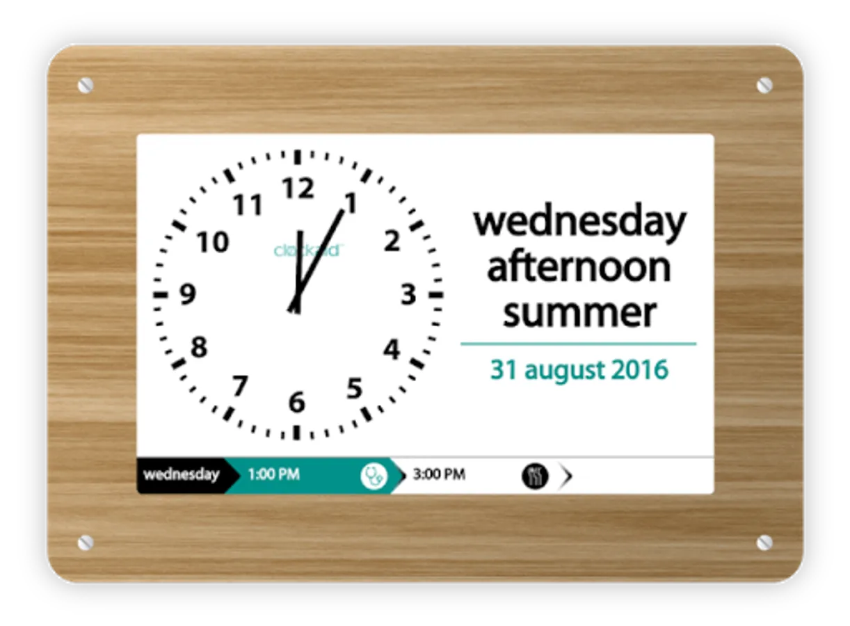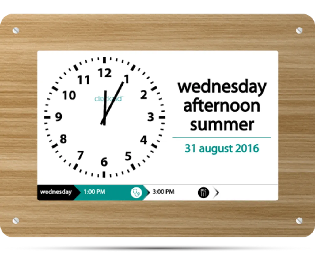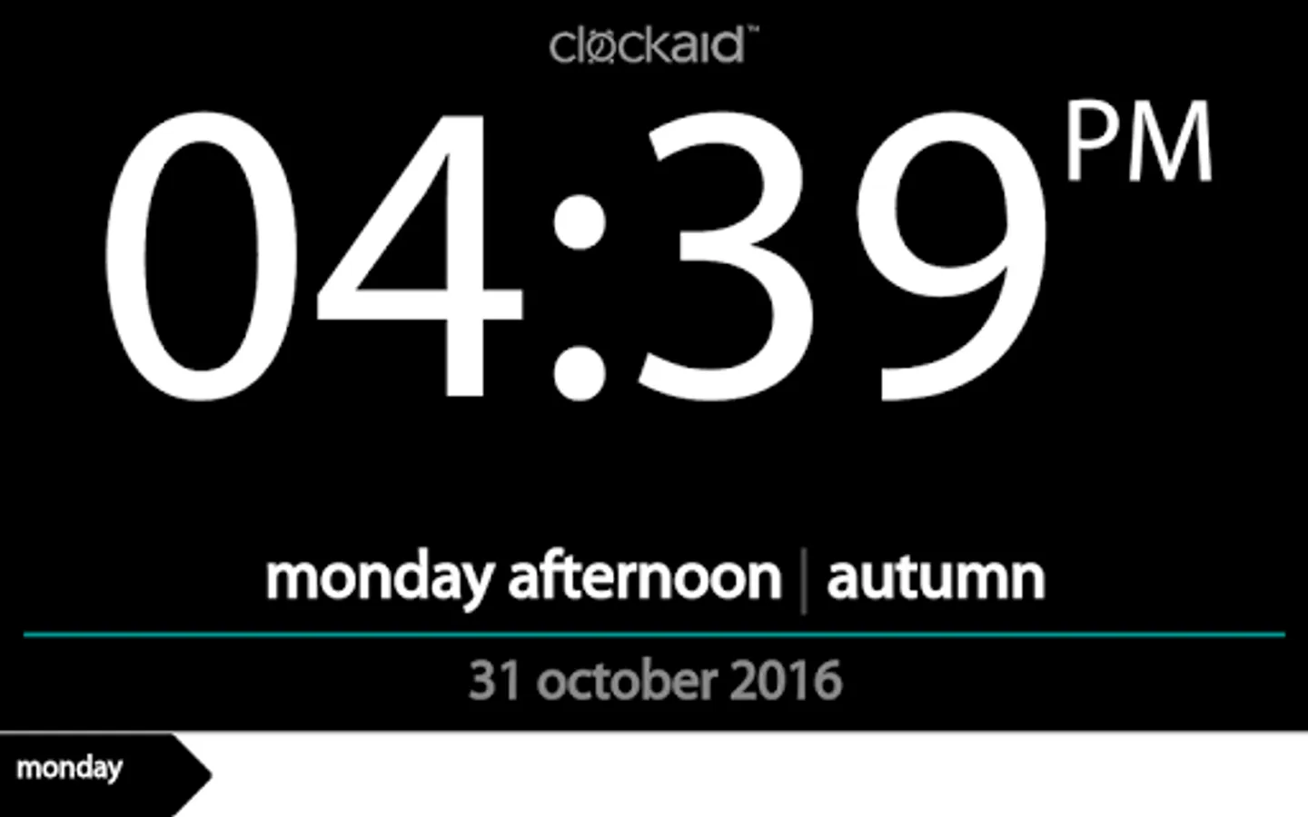 Clockaid calendar clock is specially designed for people with memory problems and/or early dementia. Clockaid is available in 2 versions: Clockaid Time and Clockaid Connect.