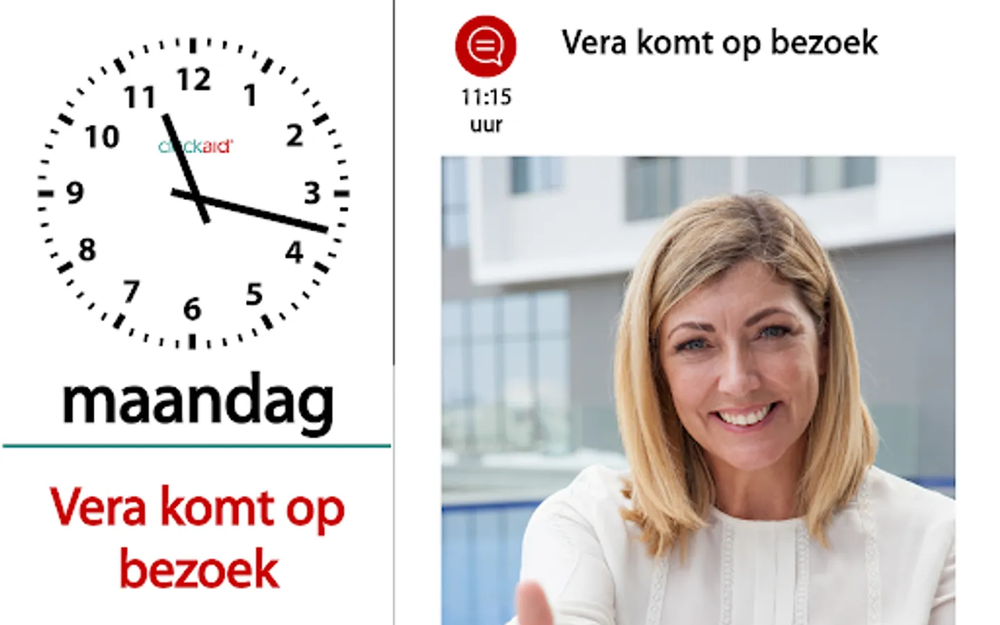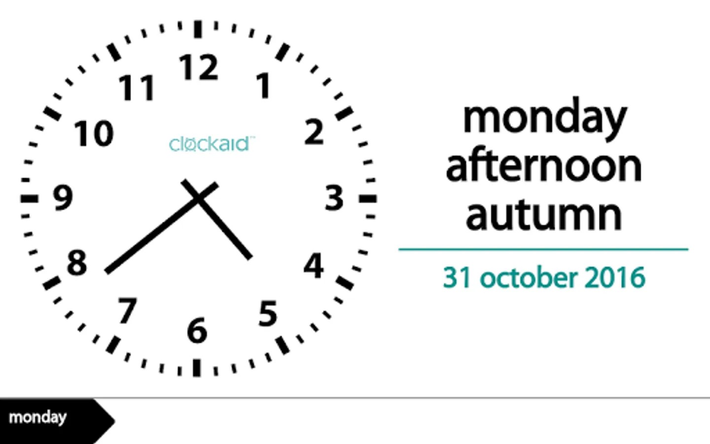 Clockaid Time shows the time (analog/digital), the day, part of the day, date, season and the weather! Available in 10 languages: NL, Eng, Du, Fr, Sp, Se, No, Fin, It.