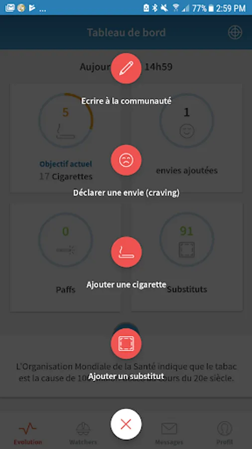 • Access to our Watchers community composed of medical professionals, smokers, former smokers or just people wanting to help you.