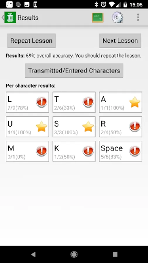 * Keeps track of your accuracy and provides a report per character at the end of a lesson.