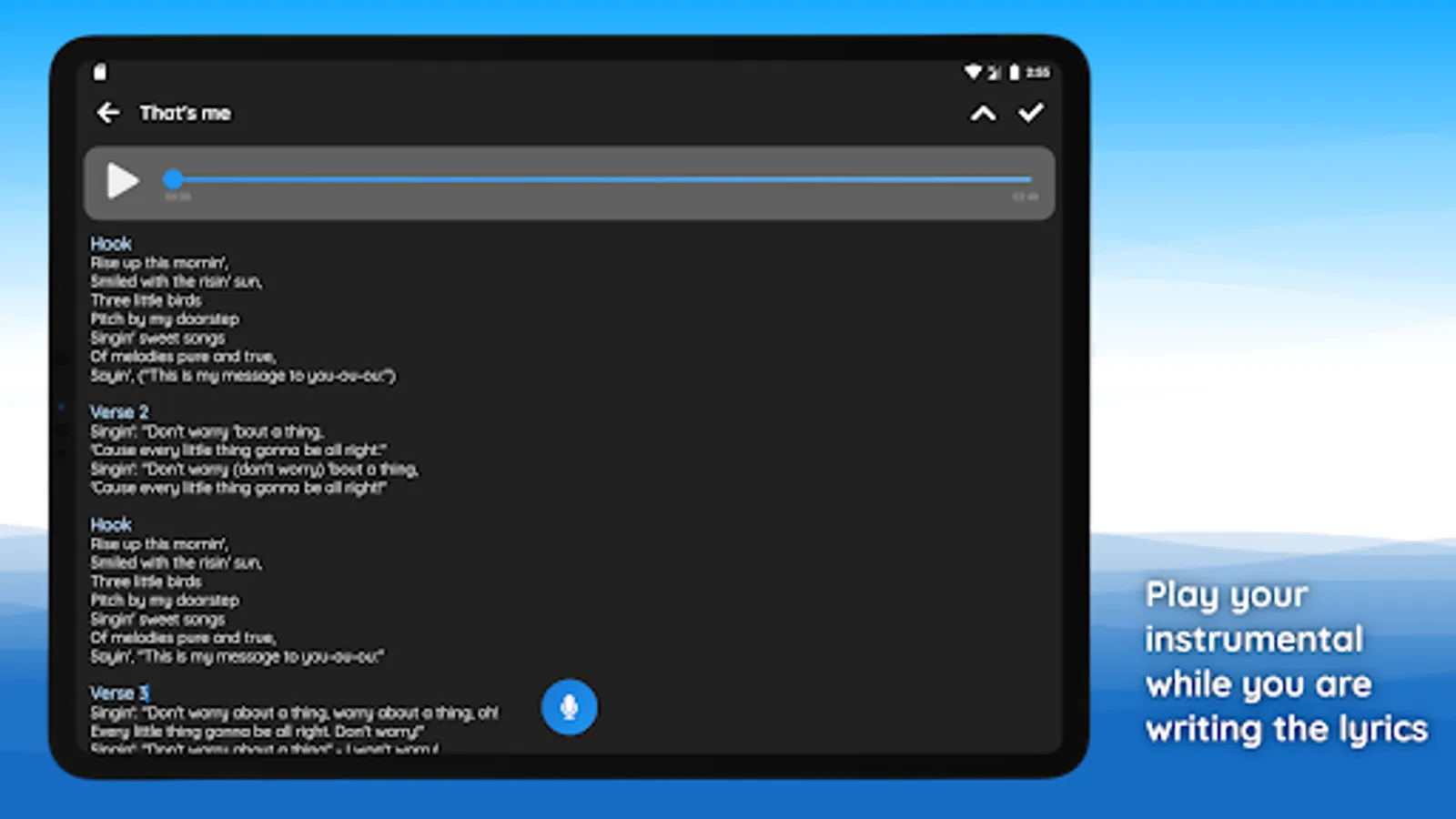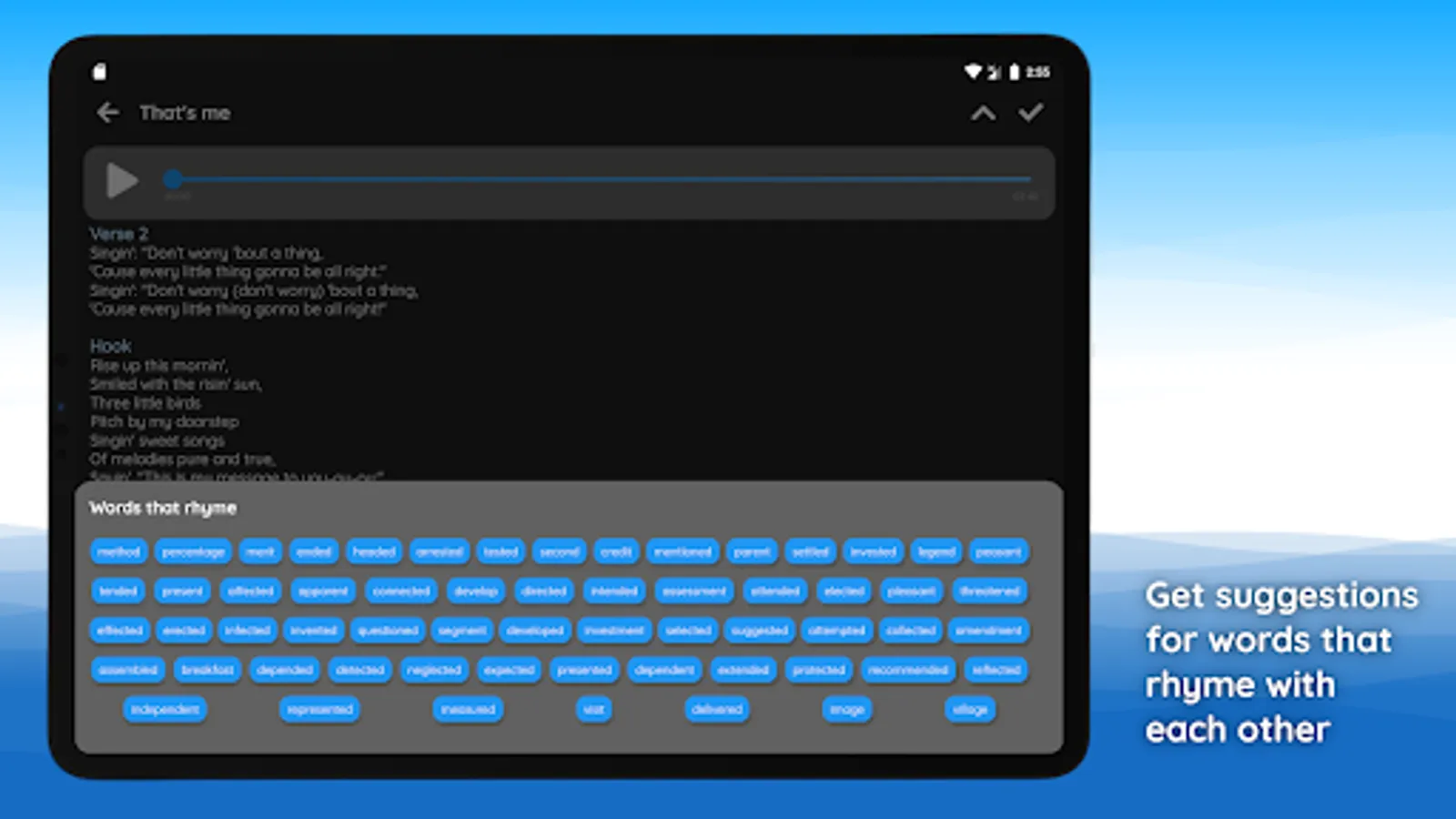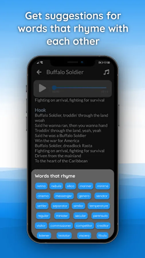 With this app it is very easy to listen to a beat and draft a song text at the same time. Writing lyrics is made easier for you, as you can easily display suitable rhymes. You can also record your ideas directly and store all you good stuff on your smartphone until you come to the studio.