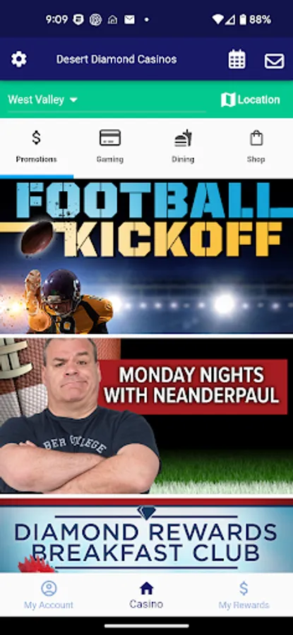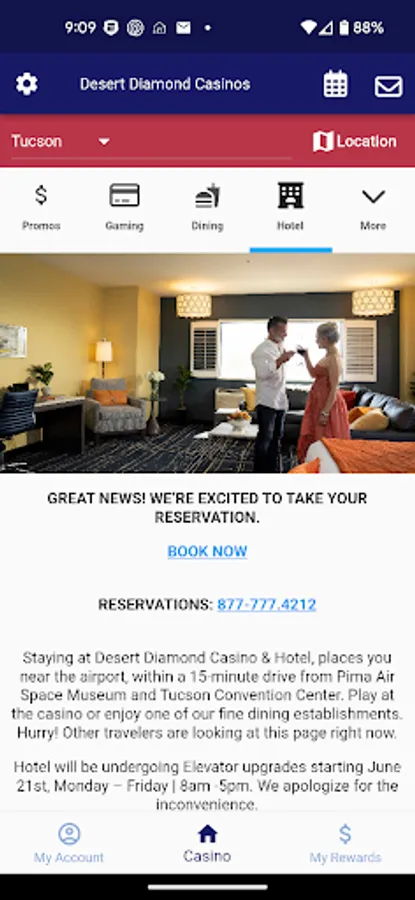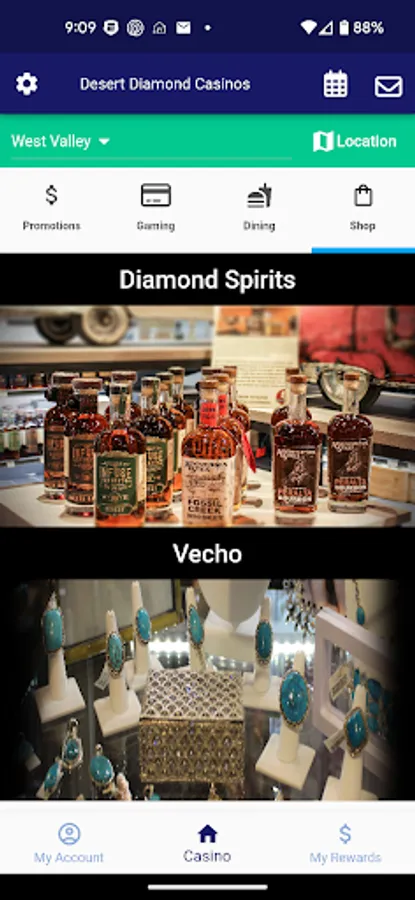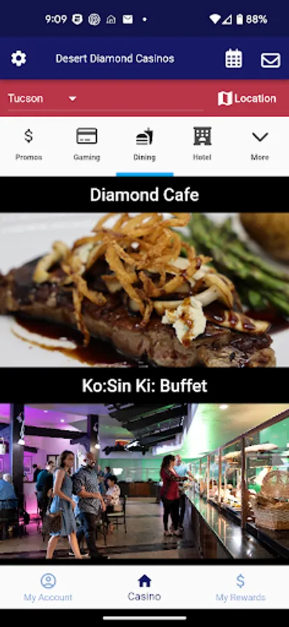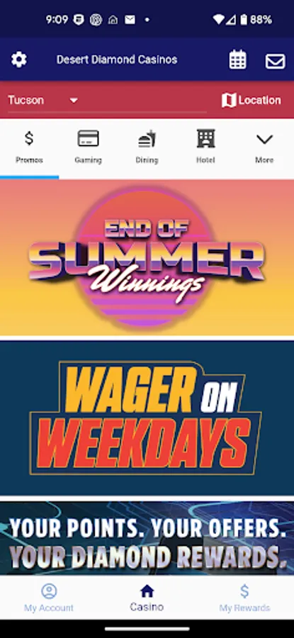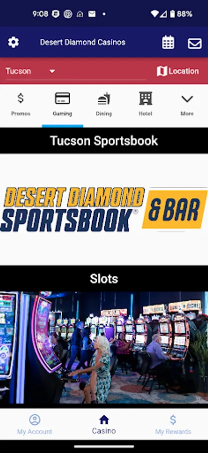 The Desert Diamond Rewards app is designed for Desert Diamond Casino patrons and players to see information about promotions, hotel, restaurants, bars and for players to log into their accounts to see Offers, Invitations and where they are towards upgrading to the next Club Level.