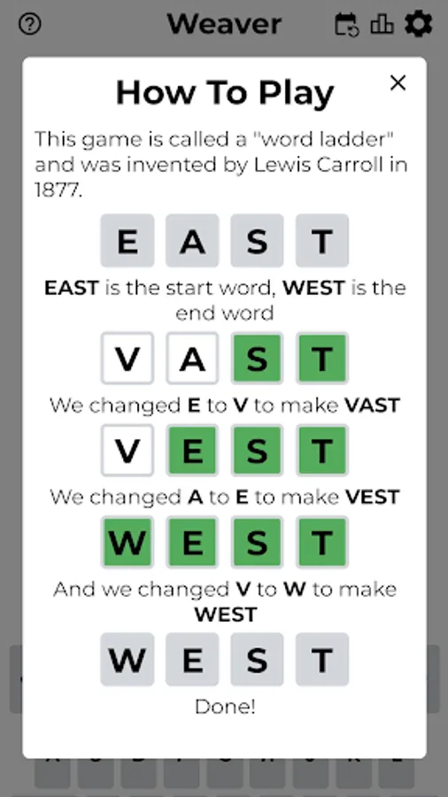 Weaver Wordle is a cool mix of the popular Word Ladder and Wordle games. Unlike the original game, you know the first and last word in advance. The player's task is to turn the first word into the last one. This will require you to enter words that differ from each other by only one letter, until you go all the way to the final word.